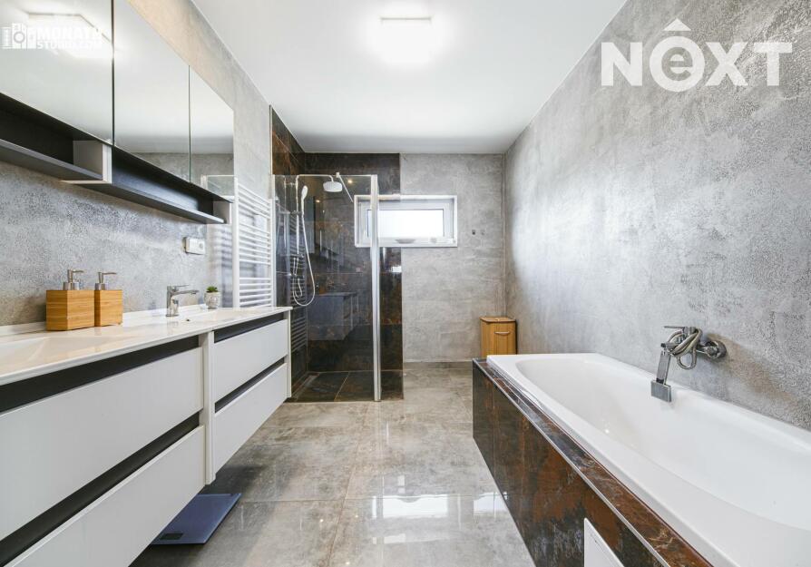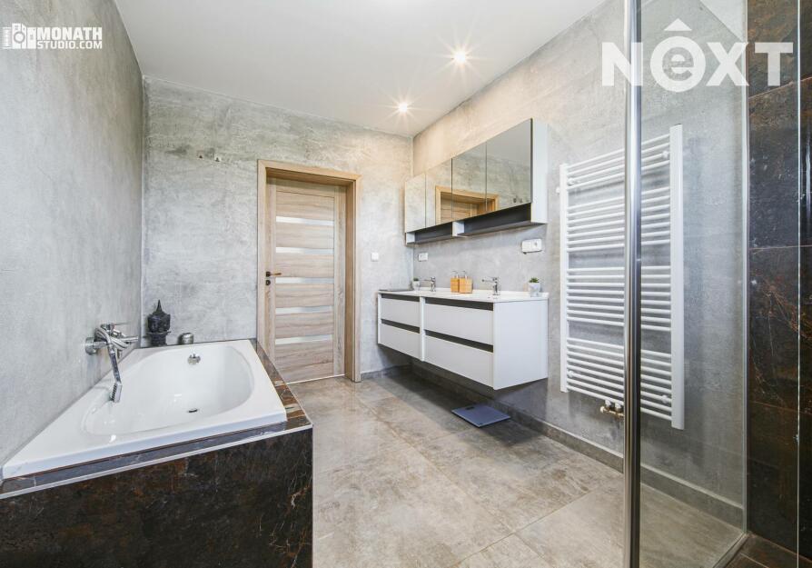 • Koupelna kombinovaná — sprchový kout i vana, dvě umyvadla se skříňkami.
