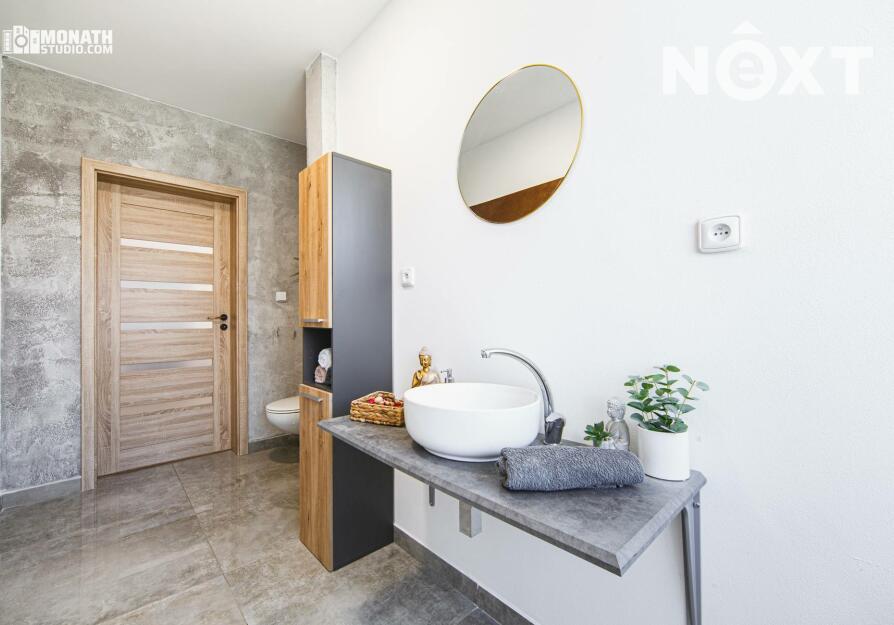 • Koupelna a WC: velkoformátová dlažba v dekoru šedého betonu.