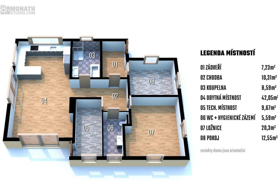 • Technická místnost s plynovým kotlem, místem pro pračku a sušičku; příprava na krbová kamna.