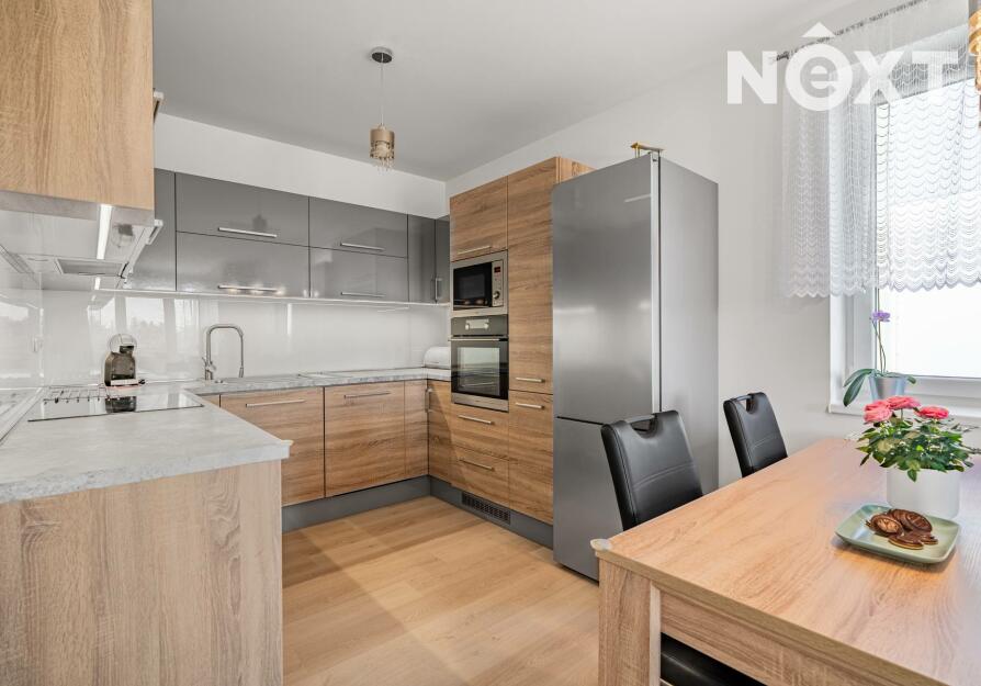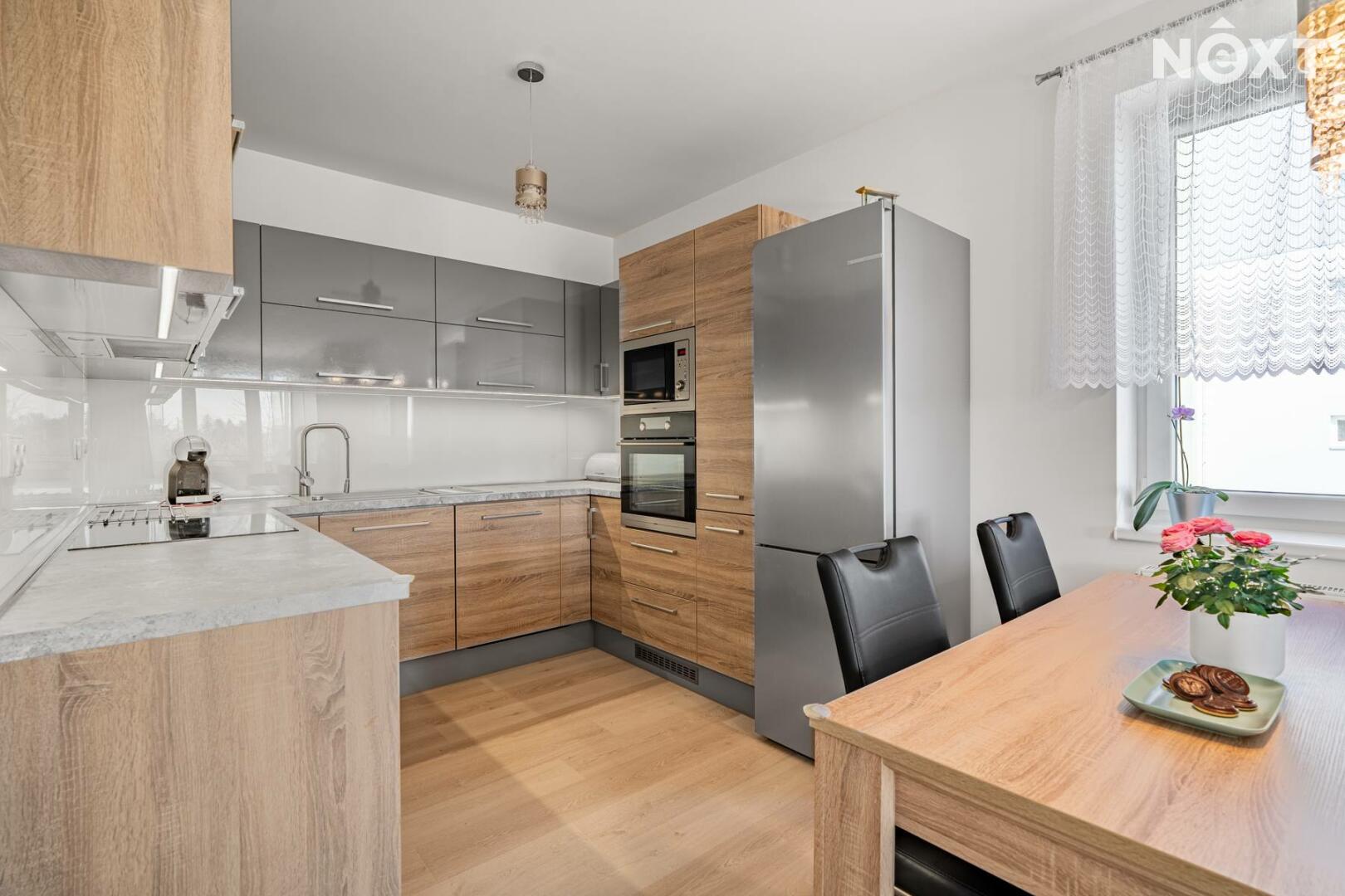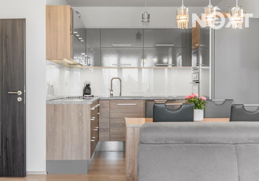 Byt disponuje obývacím pokojem s kuchyňským koutem (34,8 m²), samostatným pokojem (12,4 m²), komorou (1,3m²), chodbou (9,2 m²), koupelnou s vanou (4,8m²) a oddělenou toaletou (1,4m²). Kuchyňská linka je vybavena spotřebiči značky Mora. V předsíni se nachází prostorná vestavěná skříň, která nabízí dostatek úložného prostoru.