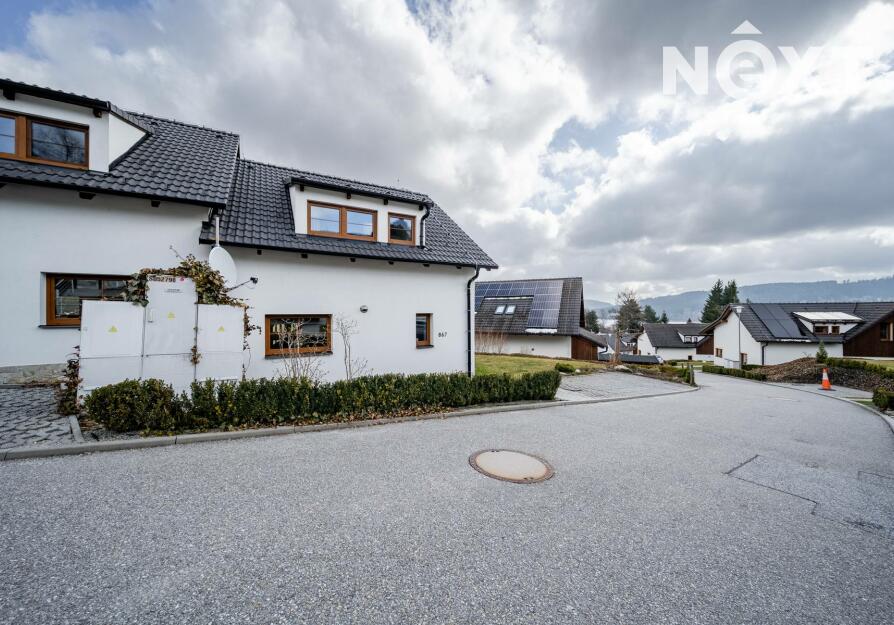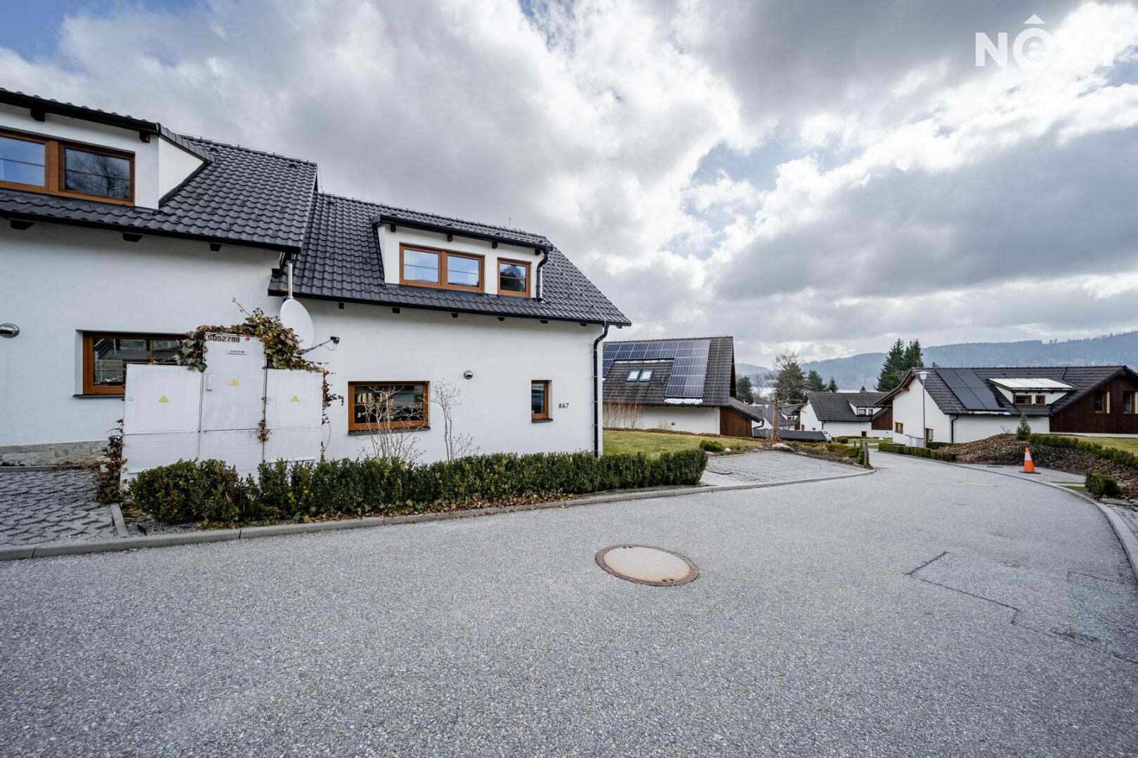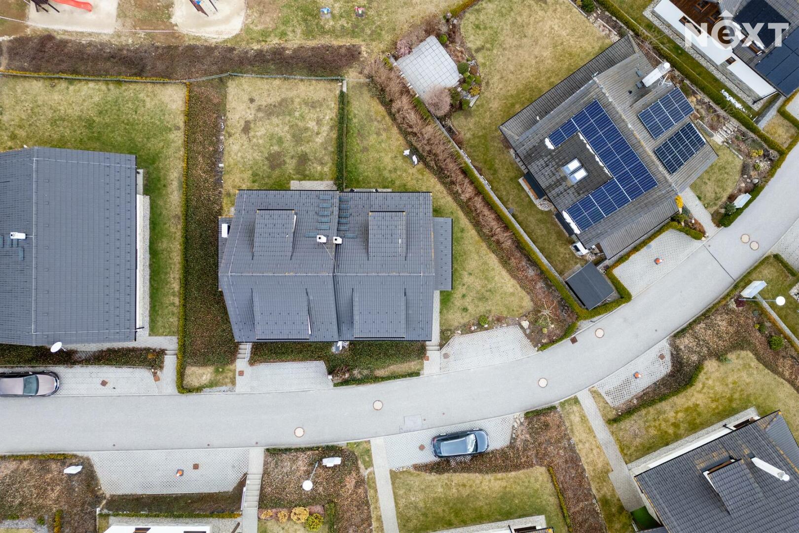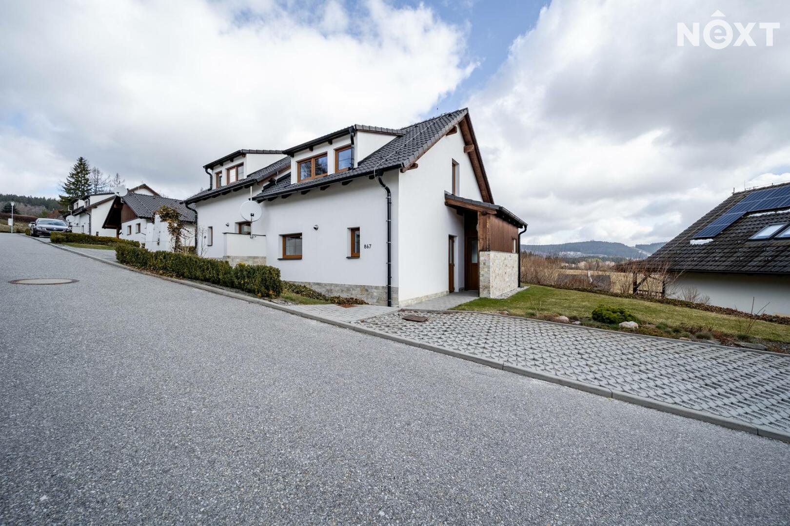 Už při příjezdu je jasné, že tady to není náhoda. Klidná rezidenční zástavba, upravené okolí, promyšlené umístění domu na pozemku, který vám dává soukromí i prostor. Parkování přímo u domu, pohodlný přístup, žádný stres.