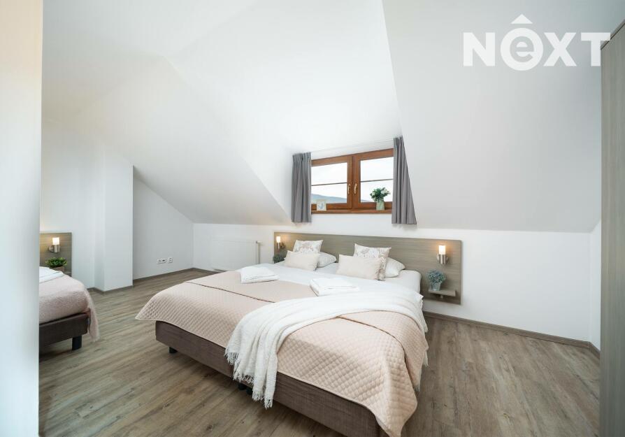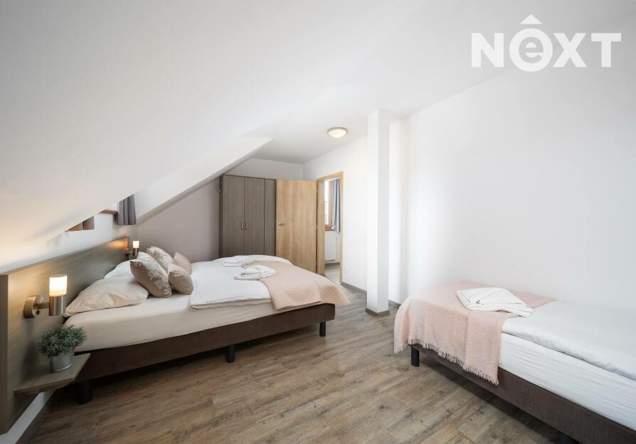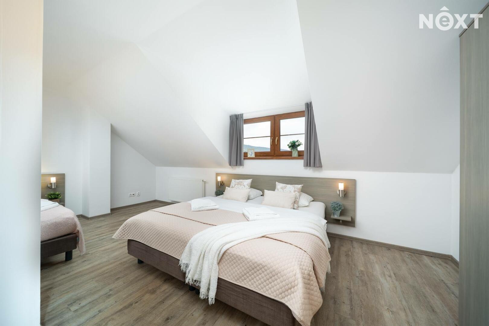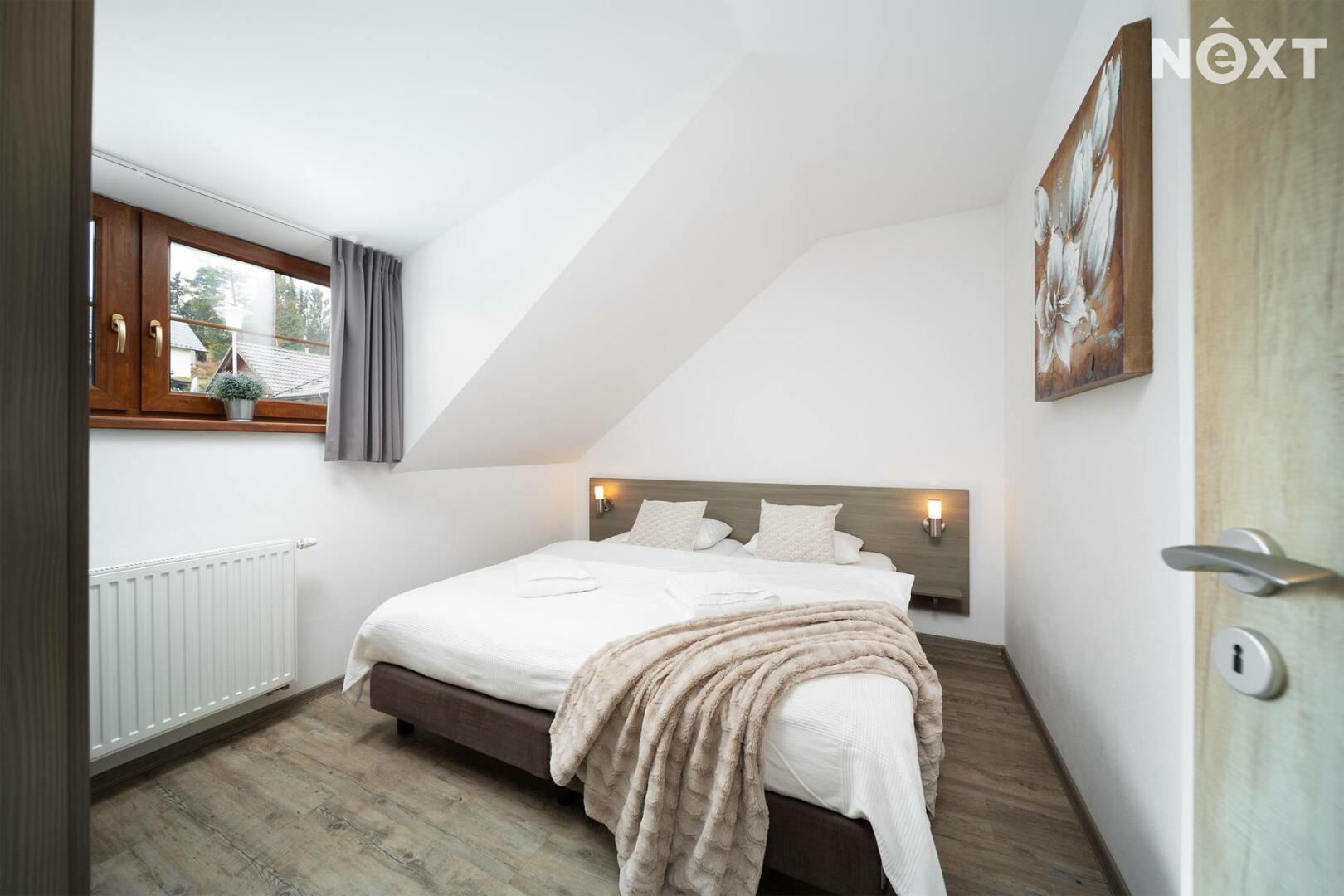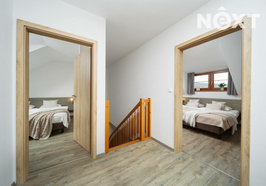 Po schodišti se přesouváme do patra, kde dům přechází do klidové zóny. Dva samostatné pokoje, které dávají flexibilitu – hlavní ložnice a další pokoj, který bez problémů pojme děti, hosty nebo další klienty v rámci krátkodobého pronájmu. Koupelna s vanou je čistá, moderní a připravená na každodenní komfort.