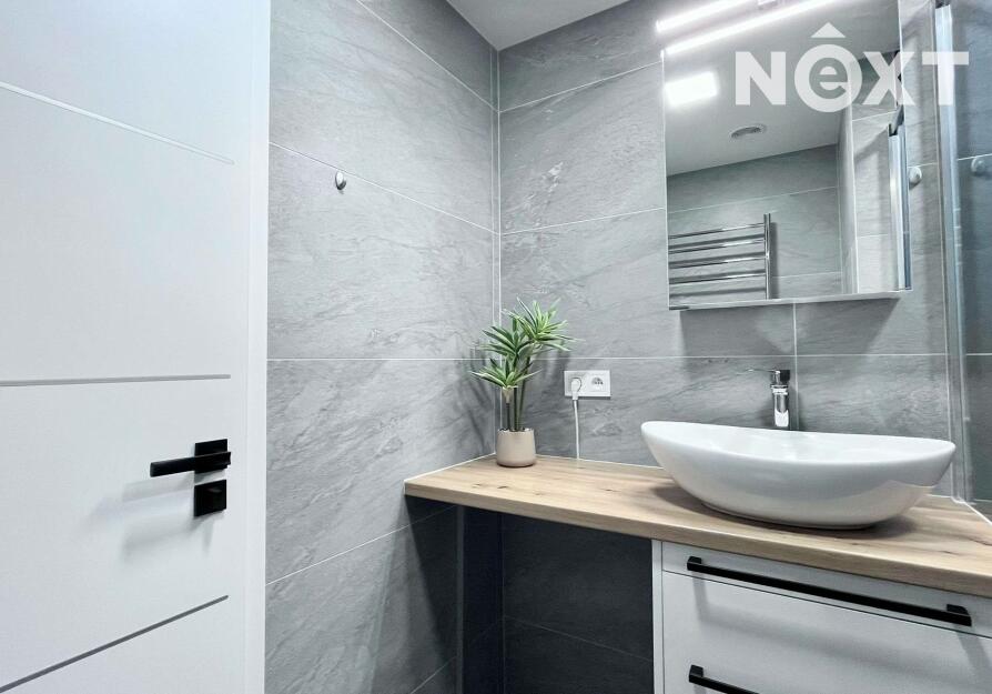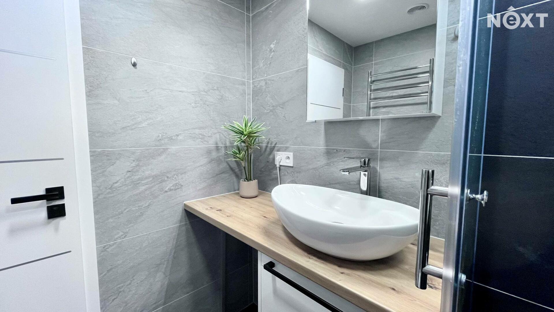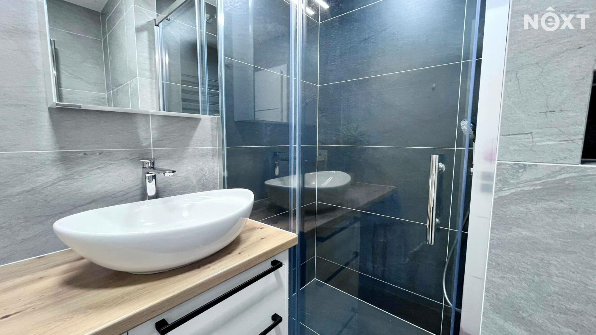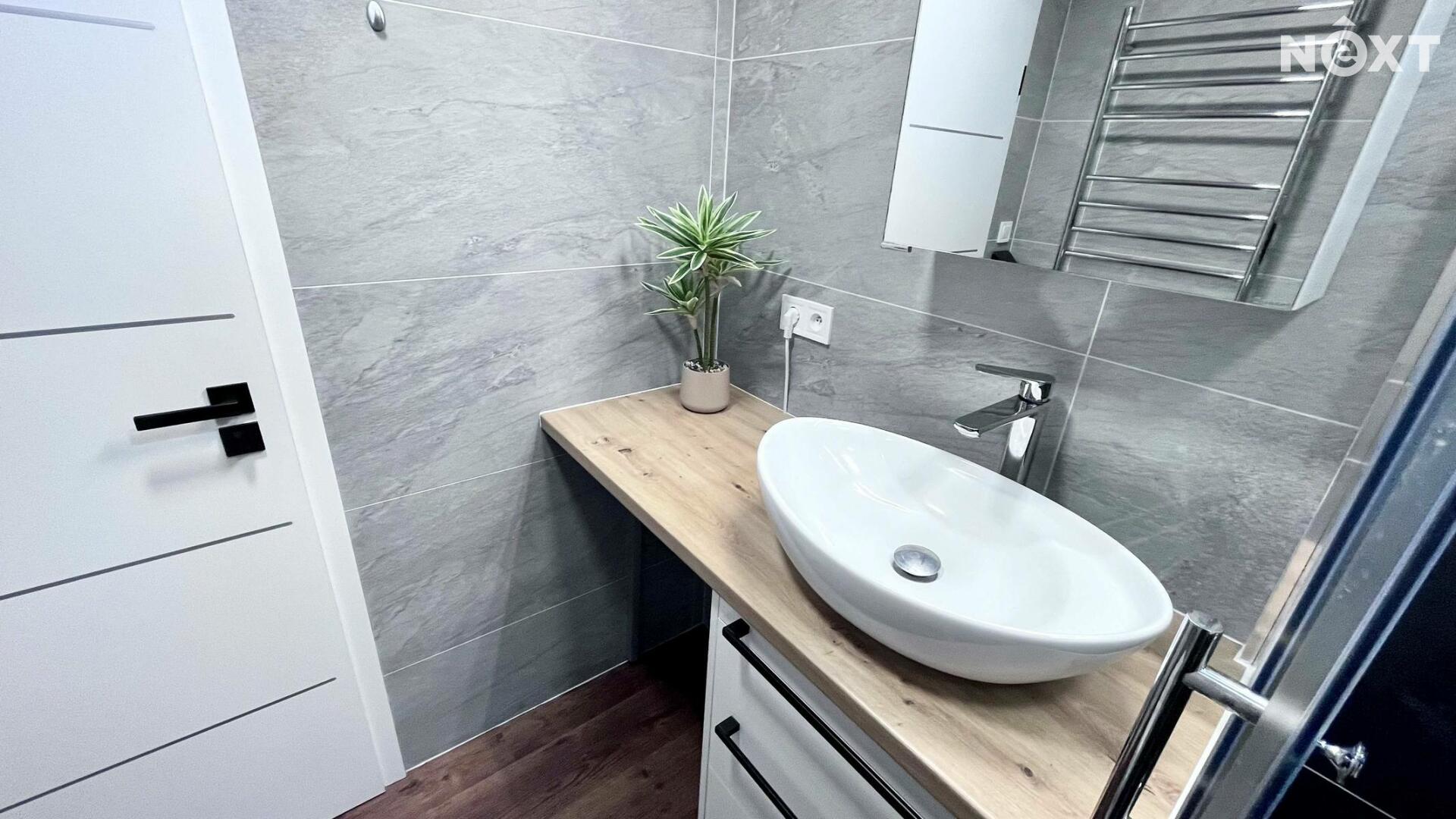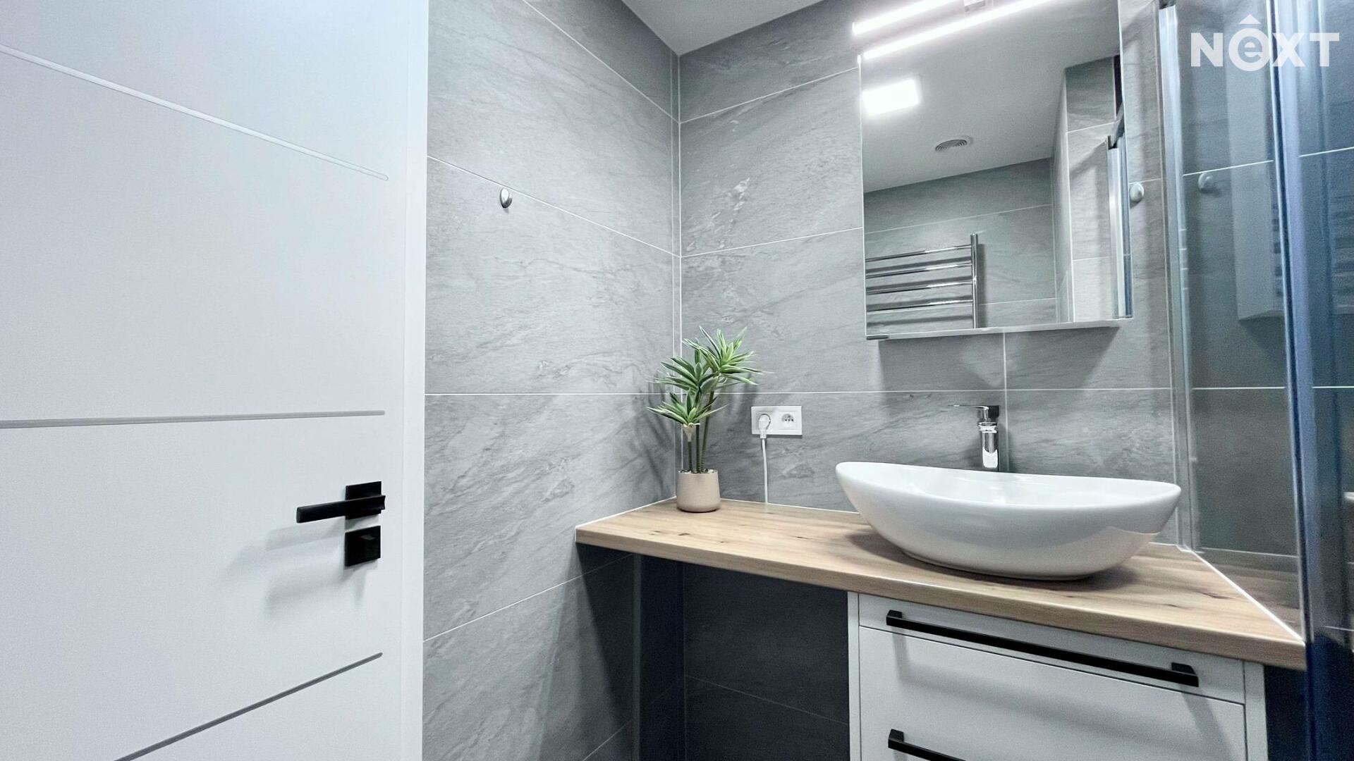 Velkým benefitem je stylová koupelna se sprchovým koutem, umyvadlem a závěsným WC, provedená v moderním designu. Byt je připraven k okamžitému nastěhování.