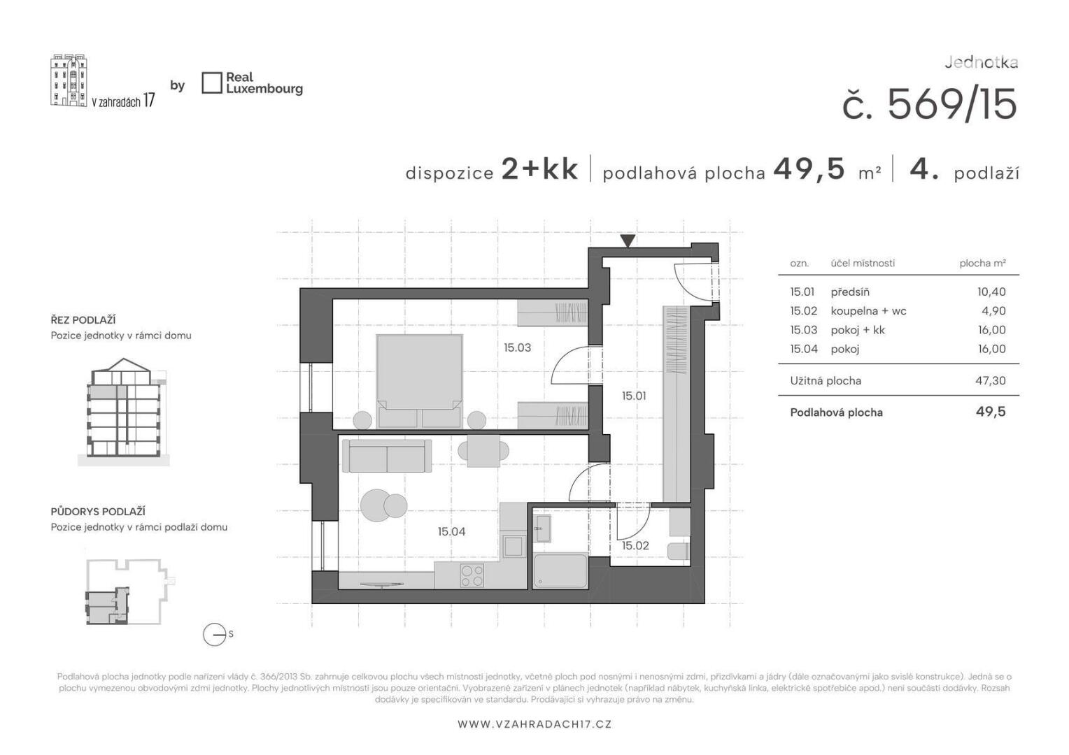Tento byt, který je součástí projektu V Zahradách 17 v Pražské Libni o dispozici 2+KK, podlahové ploše 50,4 m2 se nachází ve zvýšeném přízemí (parapet ve výšce 2,5 metru) kompletně zrekonstruovaného činžovního domu s výtahem. Má stropy vysoké 3 metry, jihovýchodní orientaci a jeho okna míří do ulice.