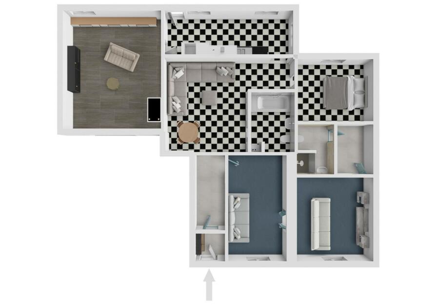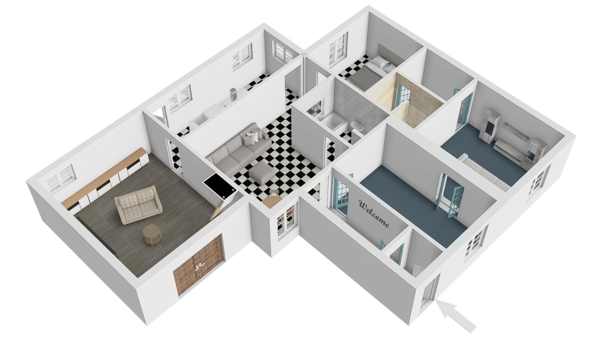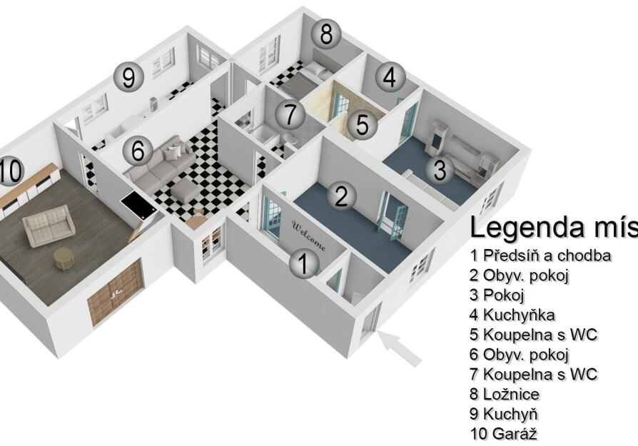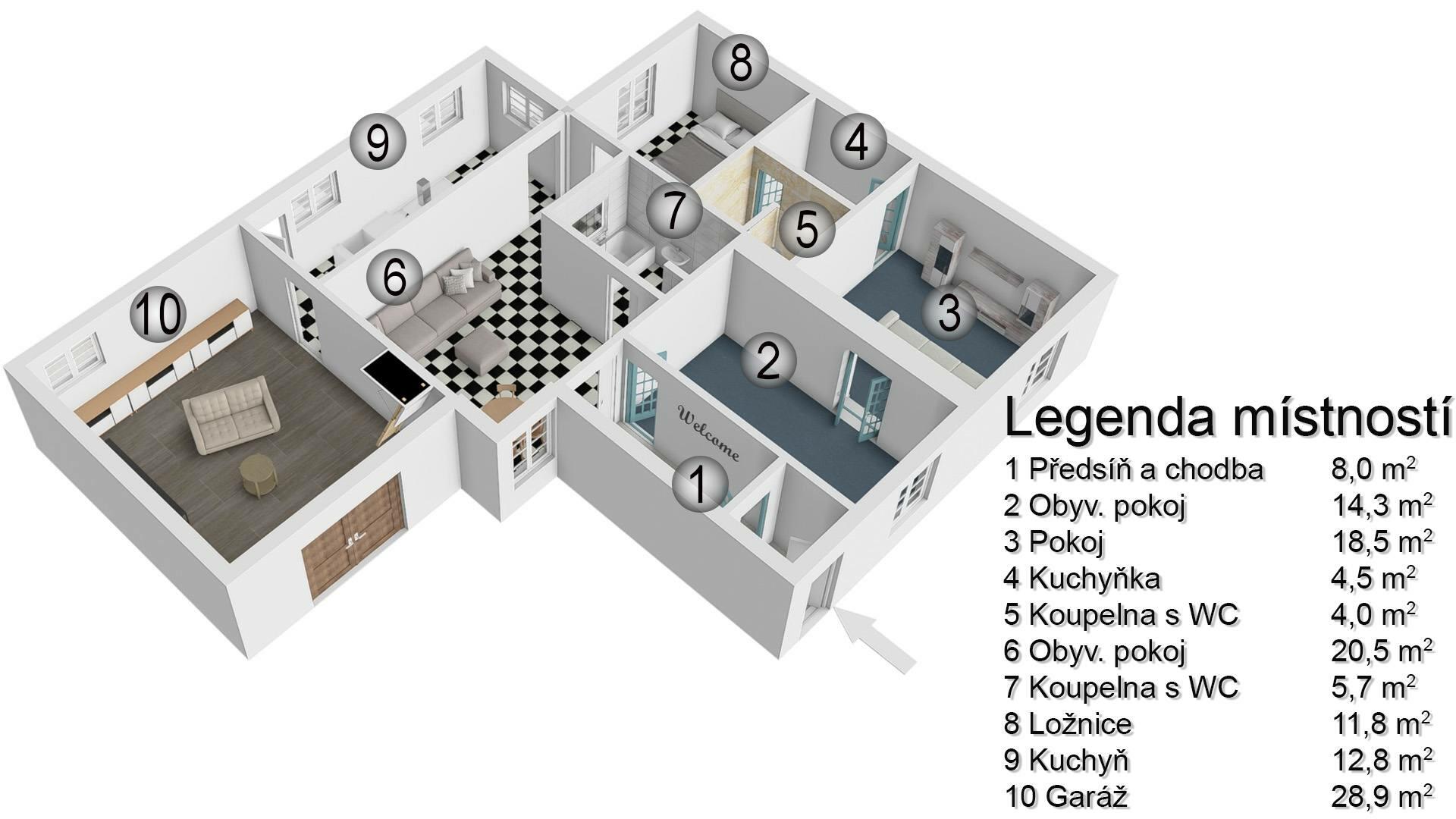* druhá bytová jednotka 2+1: obývací pokoj (20,5 m2), koupelna s WC (5,7 m2), ložnice (11,8 m2), kuchyně (12,8 m2) Dále je k dispozici společná předsíň a chodba (8 m2), garáž (28,9 m2) a sklep.