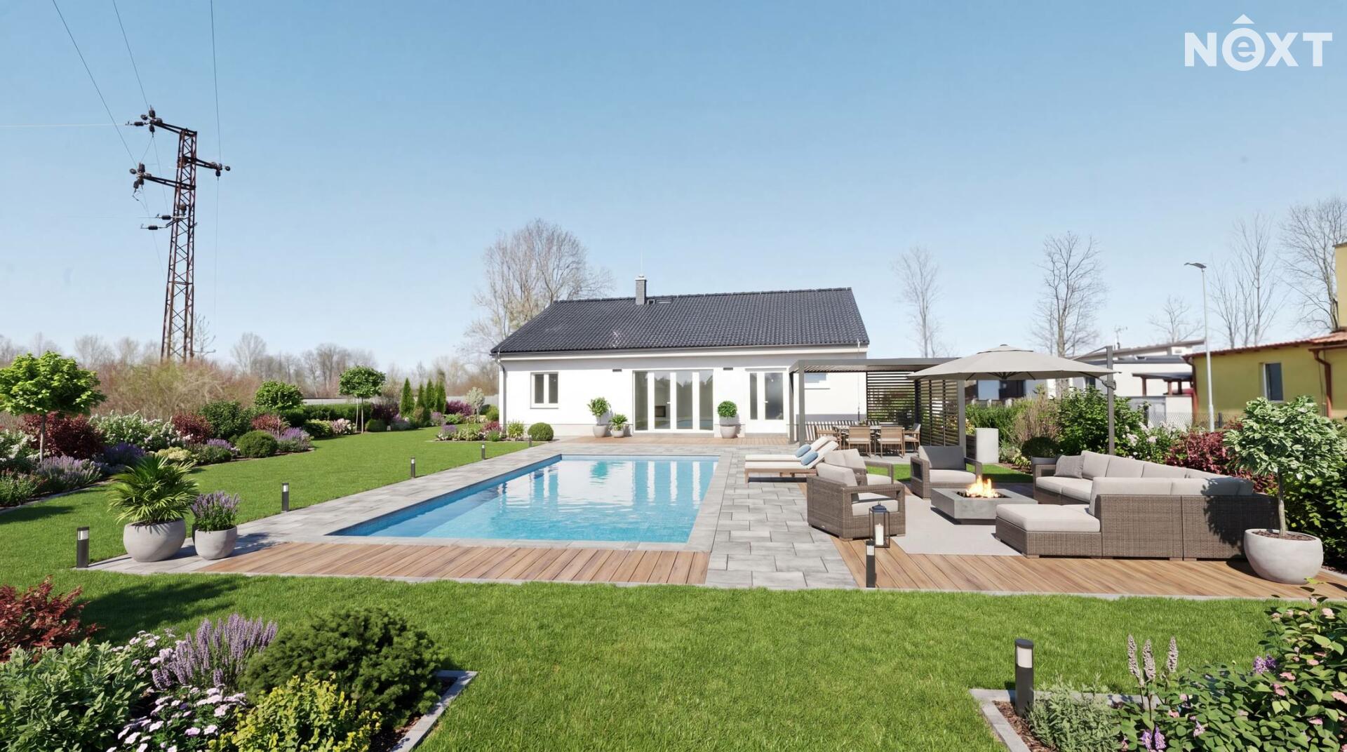 Na pozemku je připraveno štěrkové lože pro parkovací stání pro dva vozy, terasu i přístupové chodníky. Příjezd je řešen posuvnou bránou s elektrickým ovládáním (bude dokončeno před podpisem kupní smlouvy). Na základě dohody je možné doplnit například pergolu či zimní zahradu (není započteno v ceně).