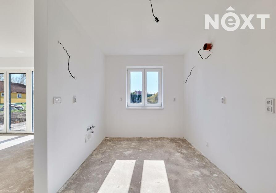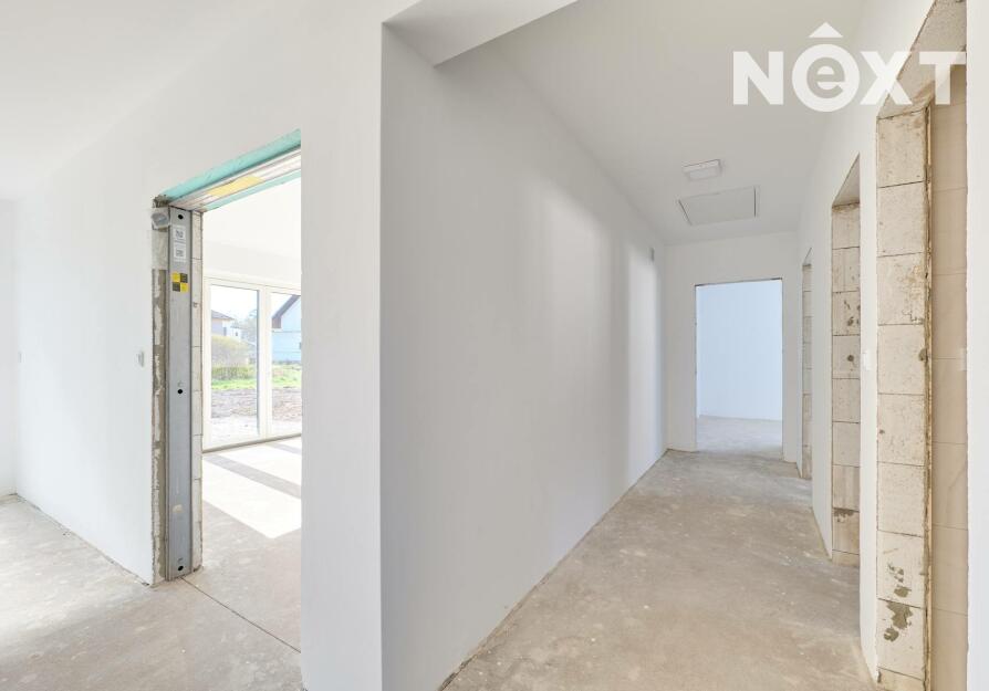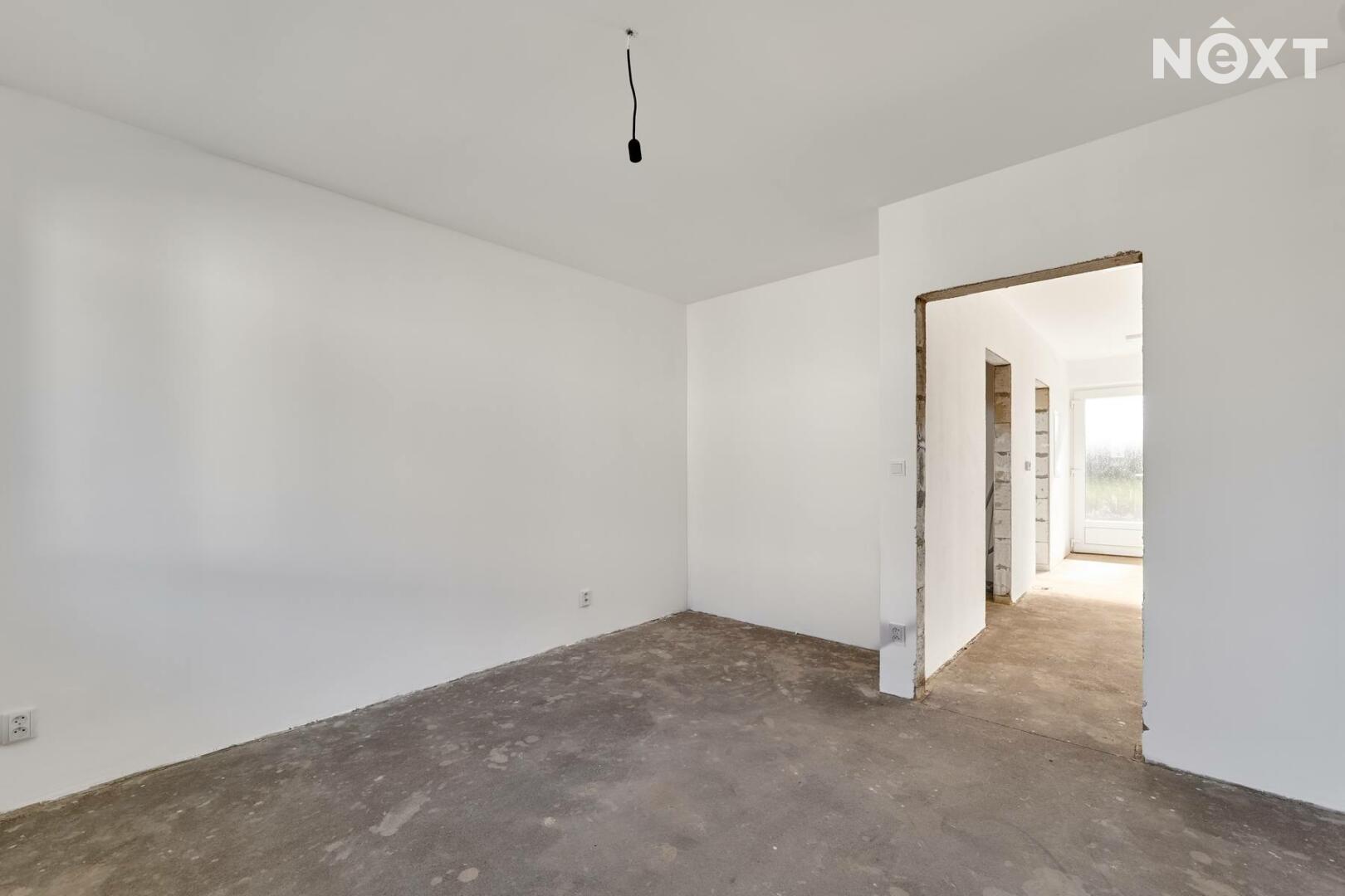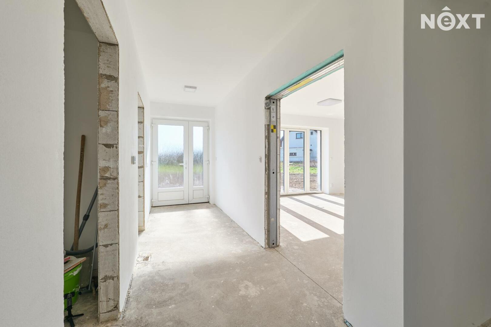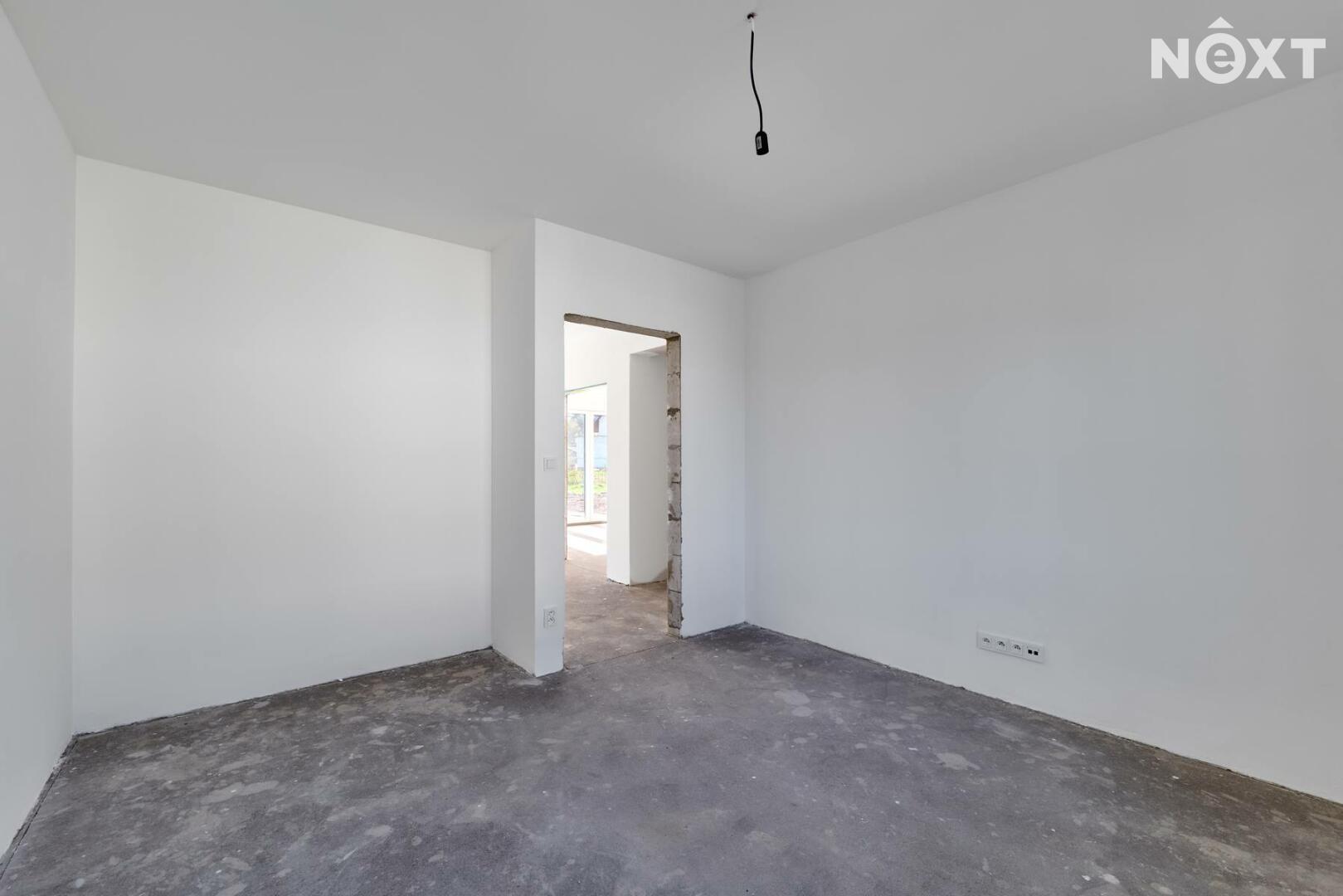 Interiér je ve fázi dokončení, což umožňuje budoucímu majiteli přizpůsobit finální podobu dle vlastních představ. Podlahy v obytných místnostech mohou být z vinylu či dlažby dle výběru (je započteno v ceně a bude dokončeno před podpisem kupní smlouvy), kuchyňská linka není součástí a lze ji realizovat individuálně. Koupelna a WC jsou již obloženy keramickými obklady a částečně vybaveny.