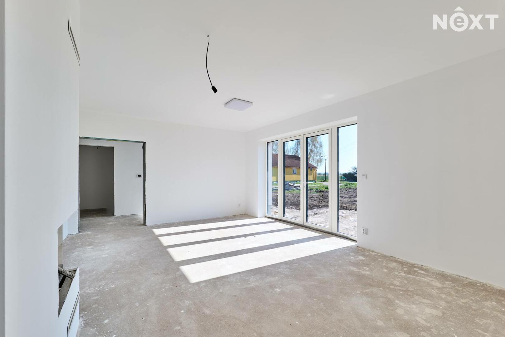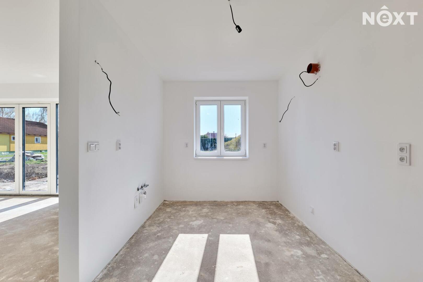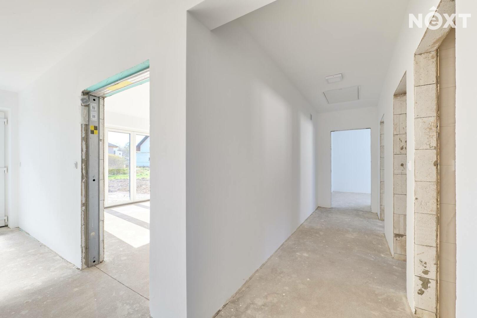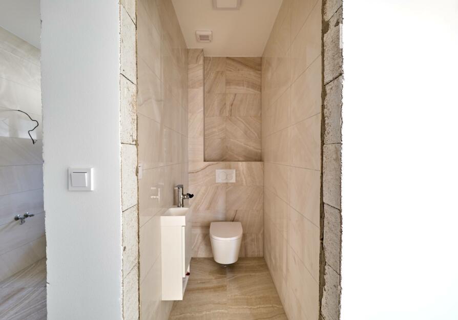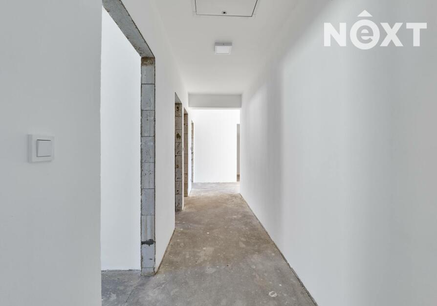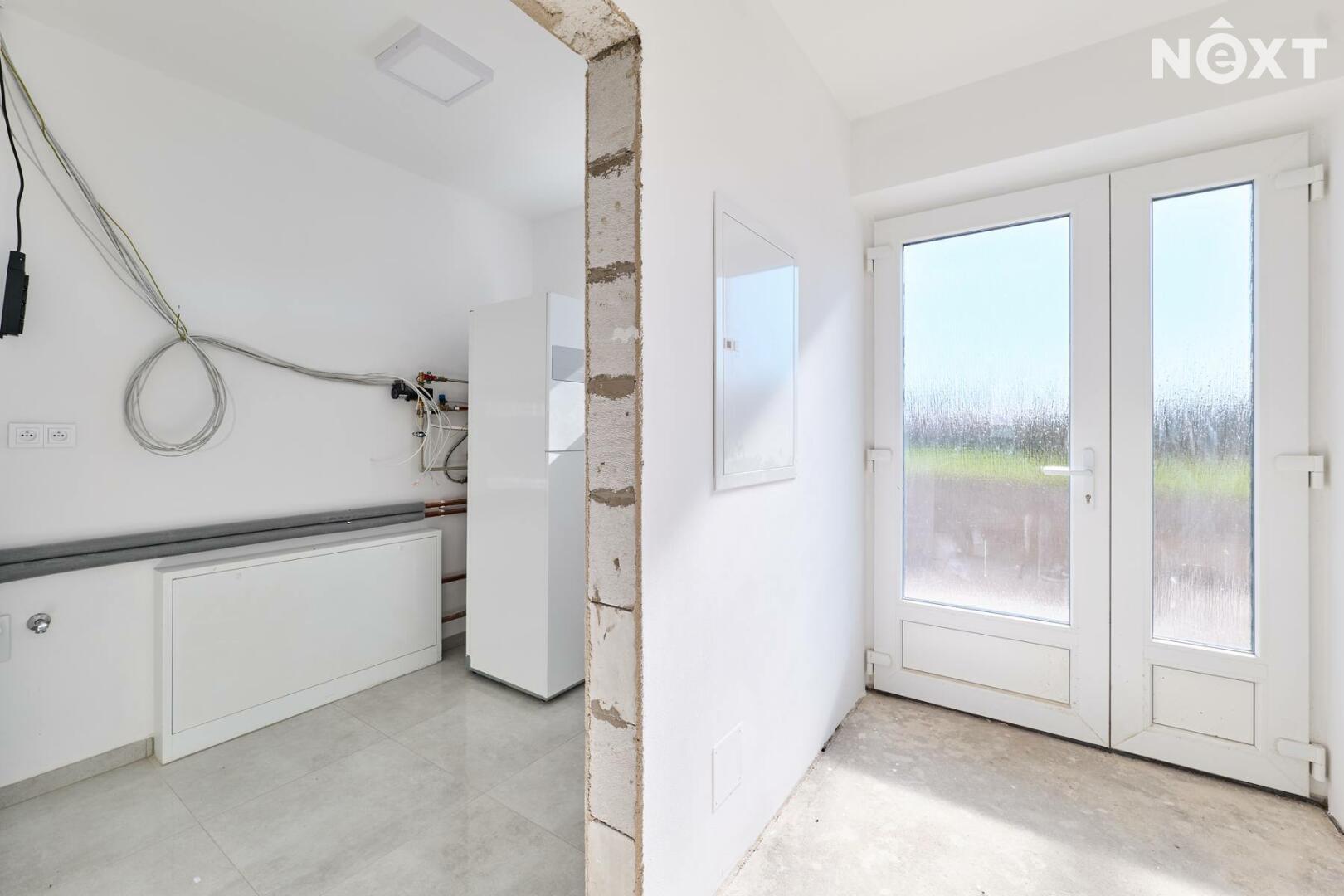 Interiér je ve fázi dokončení, což umožňuje budoucímu majiteli přizpůsobit finální podobu dle vlastních představ. Podlahy v obytných místnostech mohou být z vinylu či dlažby dle výběru (je započteno v ceně a bude dokončeno před podpisem kupní smlouvy), kuchyňská linka není součástí a lze ji realizovat individuálně. Koupelna a WC jsou již obloženy keramickými obklady a částečně vybaveny.