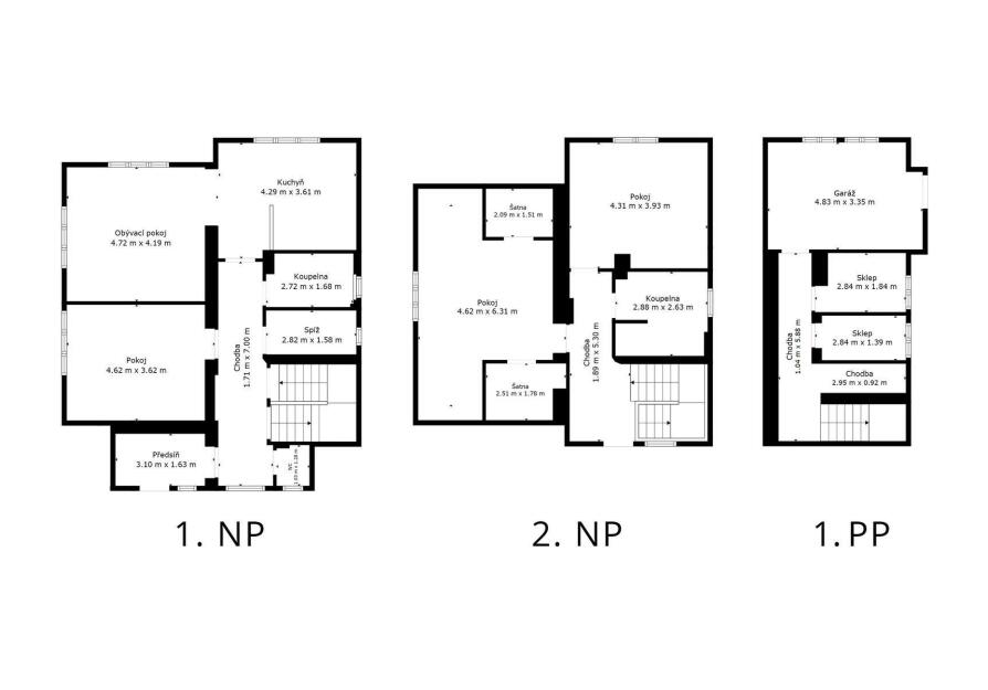 Dispozice domu je rozložena do tří podlaží. V přízemí (1. NP) se nachází vstupní chodba, kuchyně, prostorný obývací pokoj, jeden samostatný pokoj, komora, koupelna s vanou a samostatná toaleta. V horním podlaží (2. NP) jsou pak dva další samostatné pokoje a druhá koupelna se sprchovým koutem a toaletou.