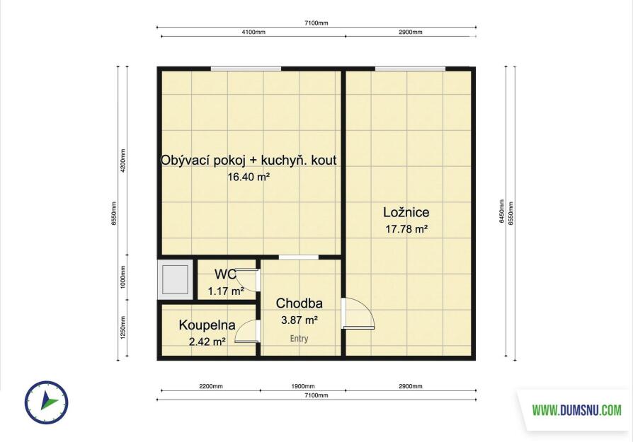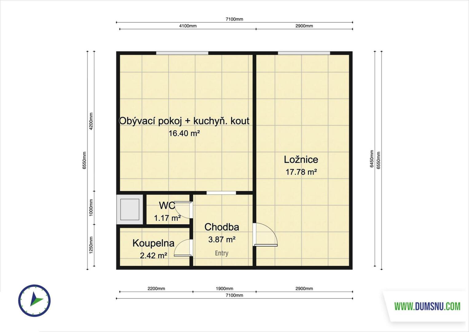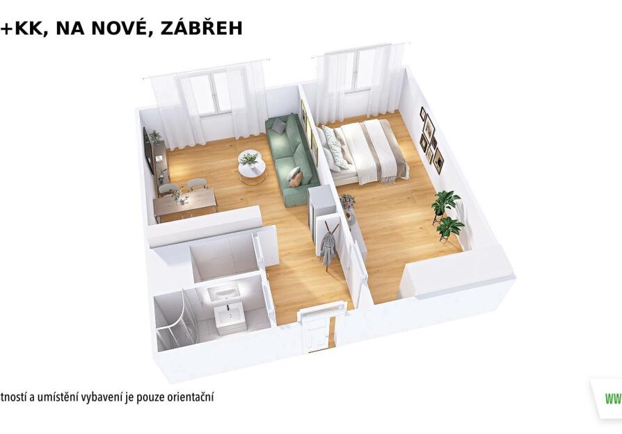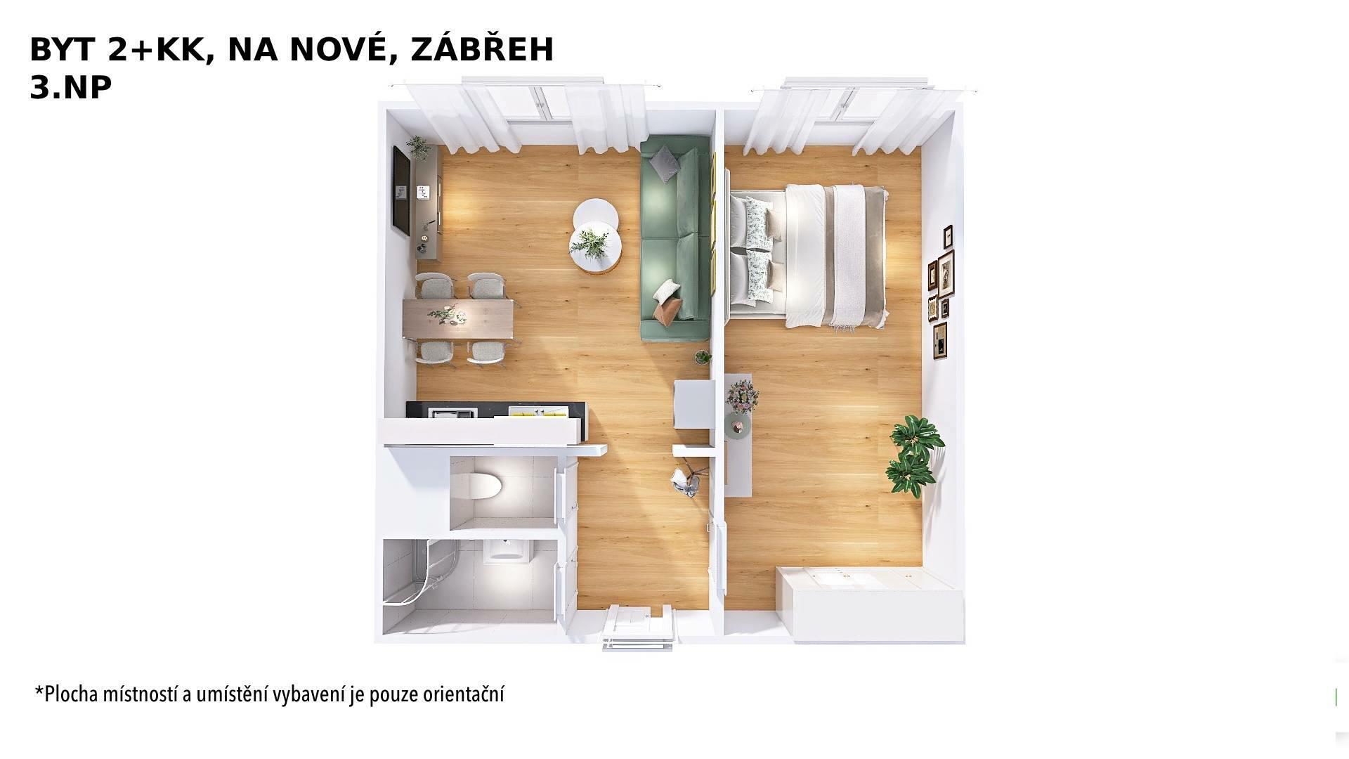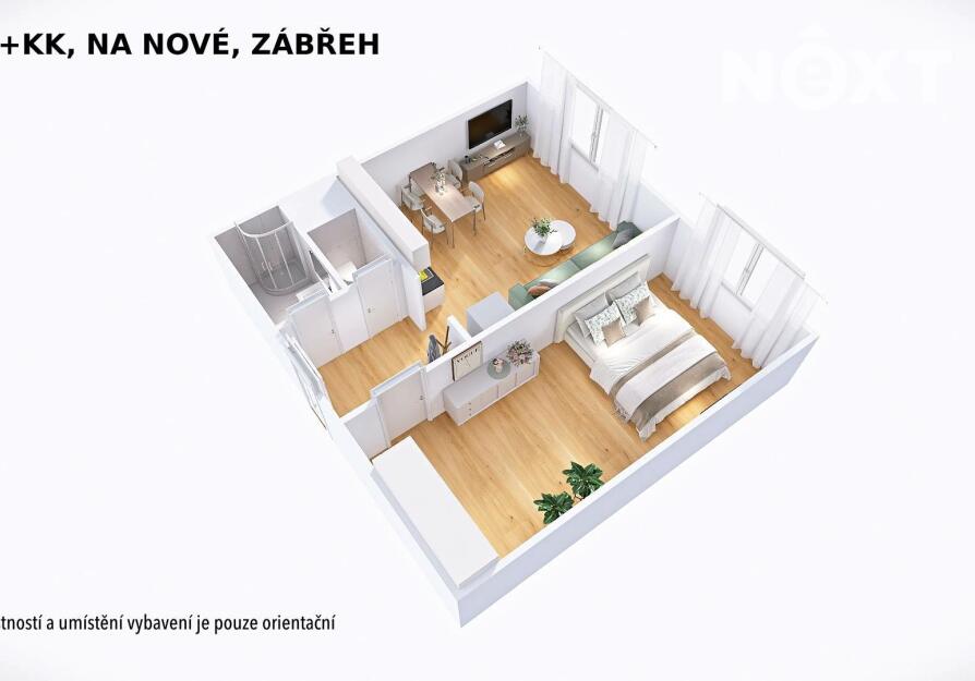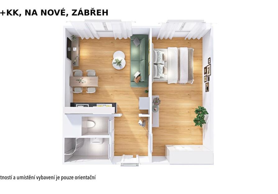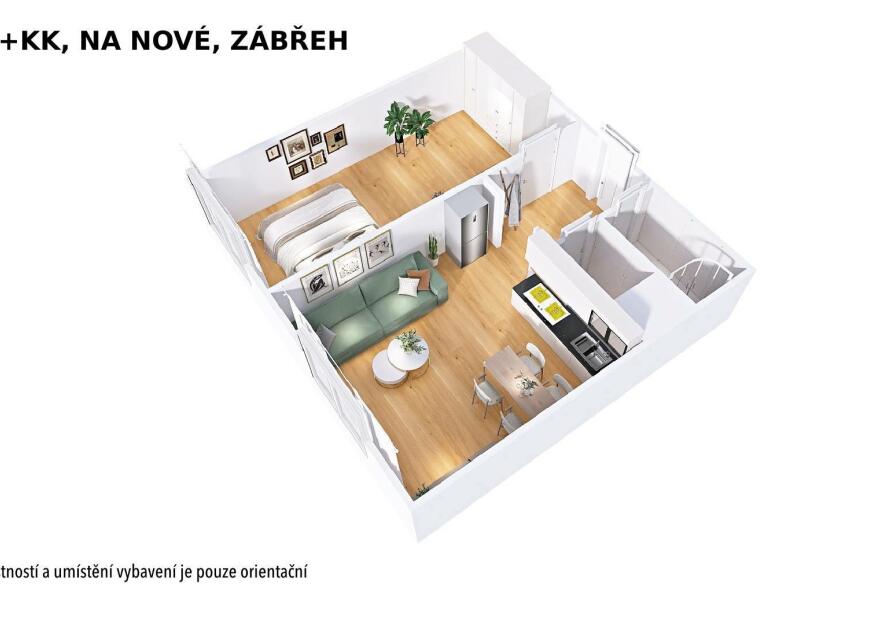 Dispozice bytu zahrnuje obývací pokoj s kuchyňským koutem, samostatný neprůchozí pokoj, předsíň, koupelnu se sprchovým koutem a samostatnou toaletu.