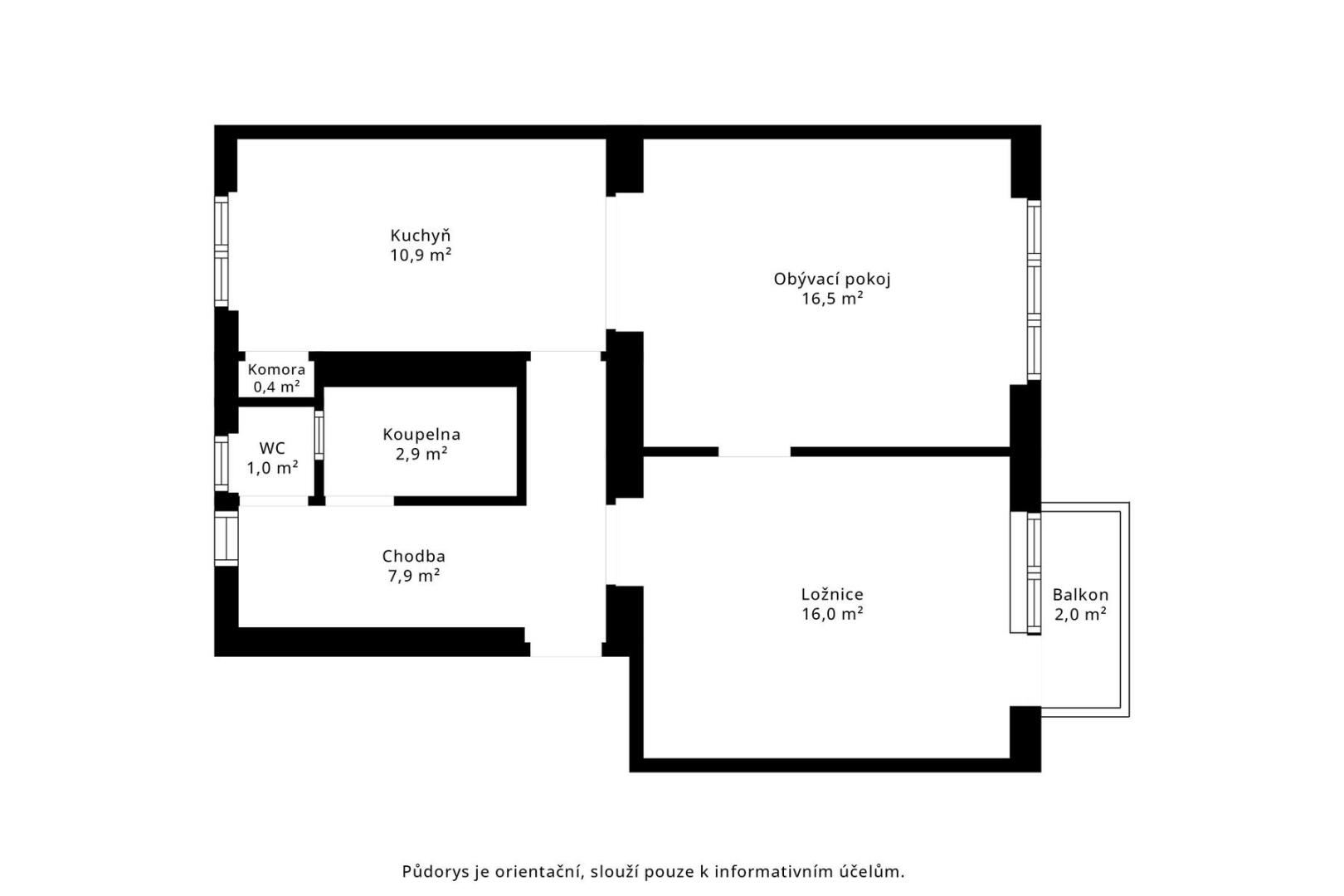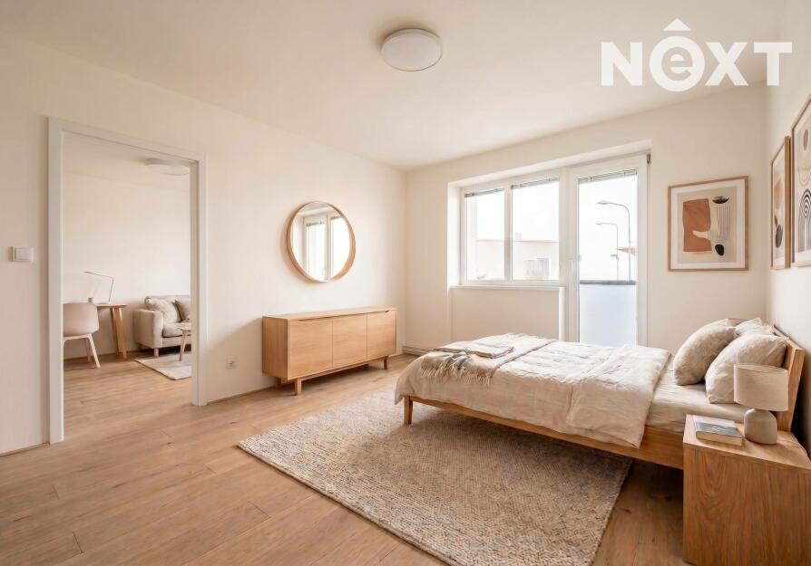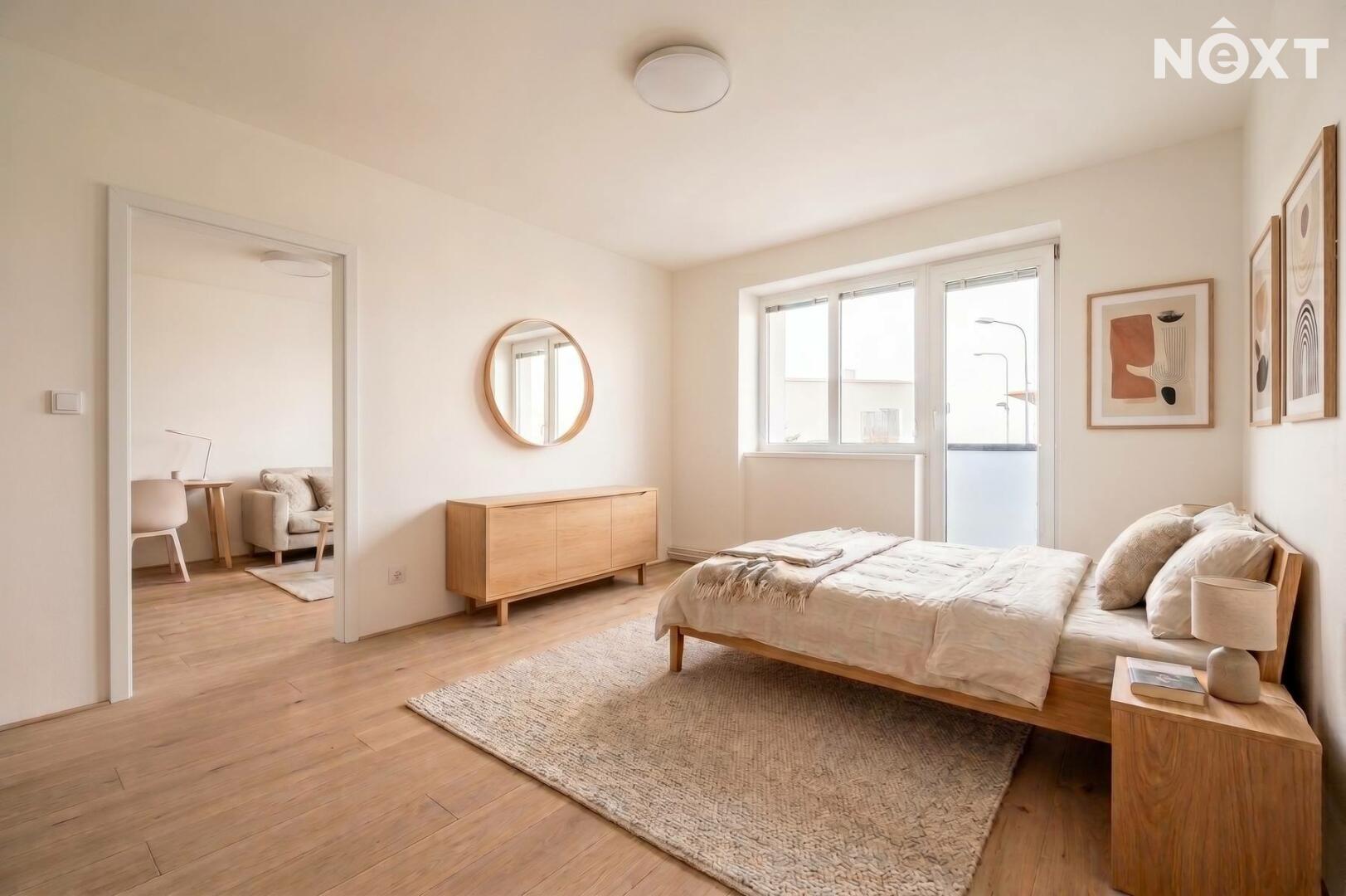Obývací pokoj a ložnice jsou orientovány na západ, díky čemuž jsou místnosti příjemně prosvětlené odpoledním sluncem. Z ložnice je přímý vstup na balkon.