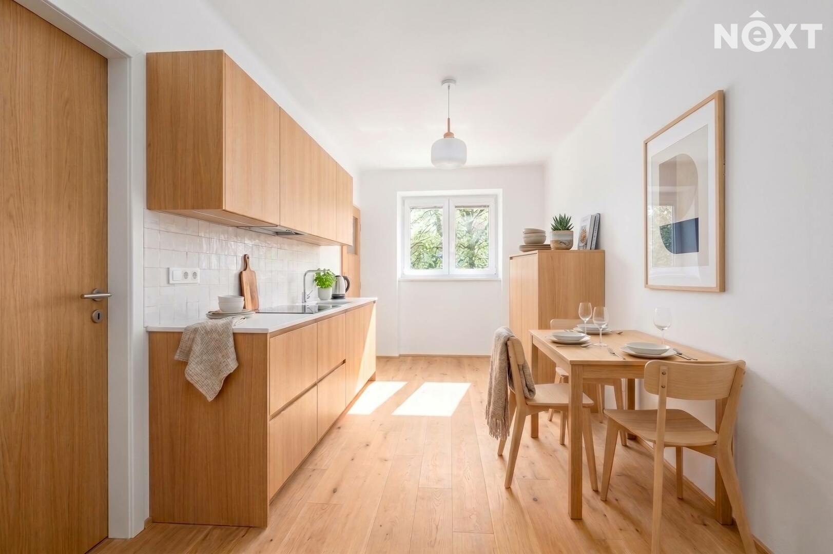 Kuchyně je orientována na východ a nabízí příjemné ranní světlo. Je přístupná jak z předsíně, tak z obývacího pokoje a její součástí je také praktická odvětrávaná spíž.