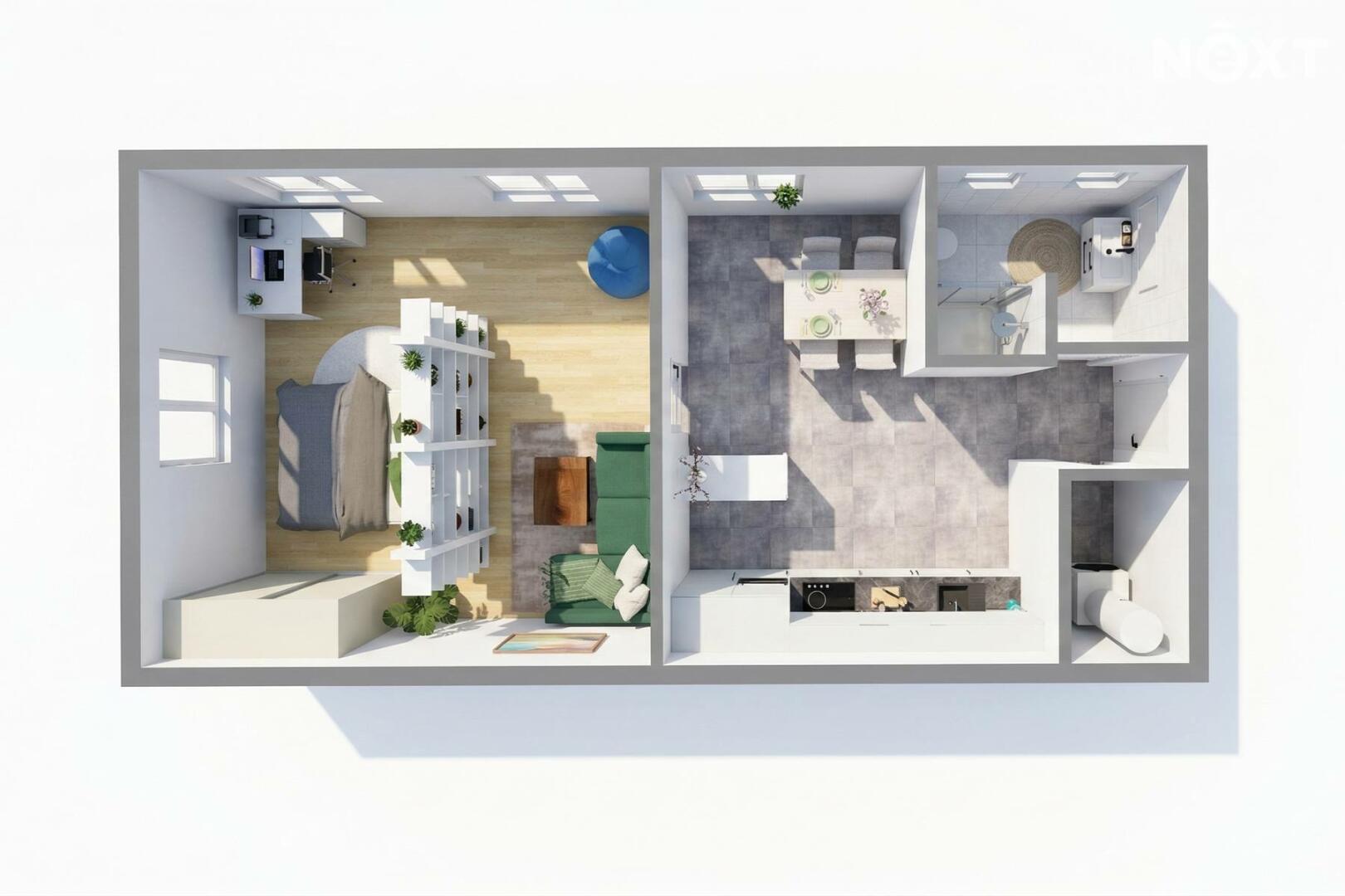Dispozice 1+1 nabízí díky své velikosti dostatek prostoru jak pro vlastní bydlení, tak i jako investici k pronájmu. Měsíční náklady nepřesahují 4 000 Kč.