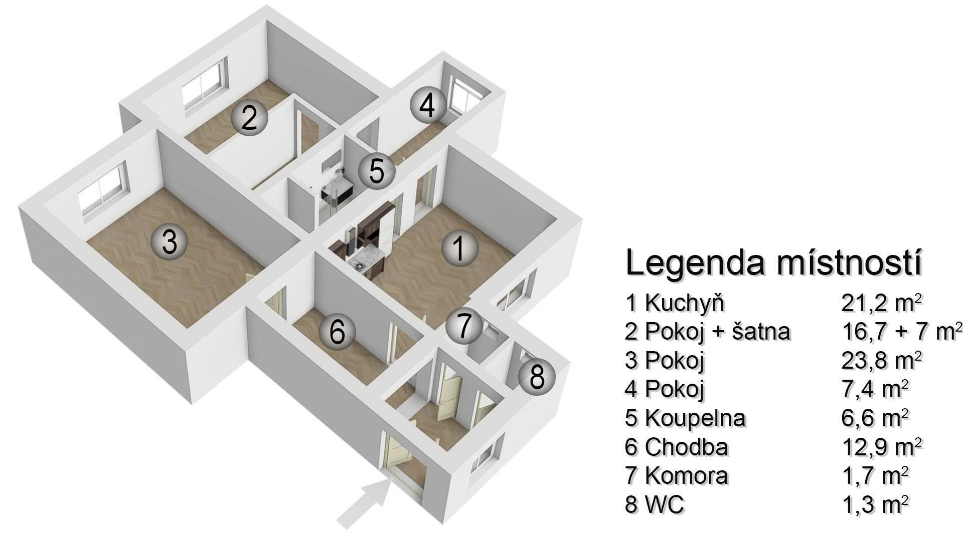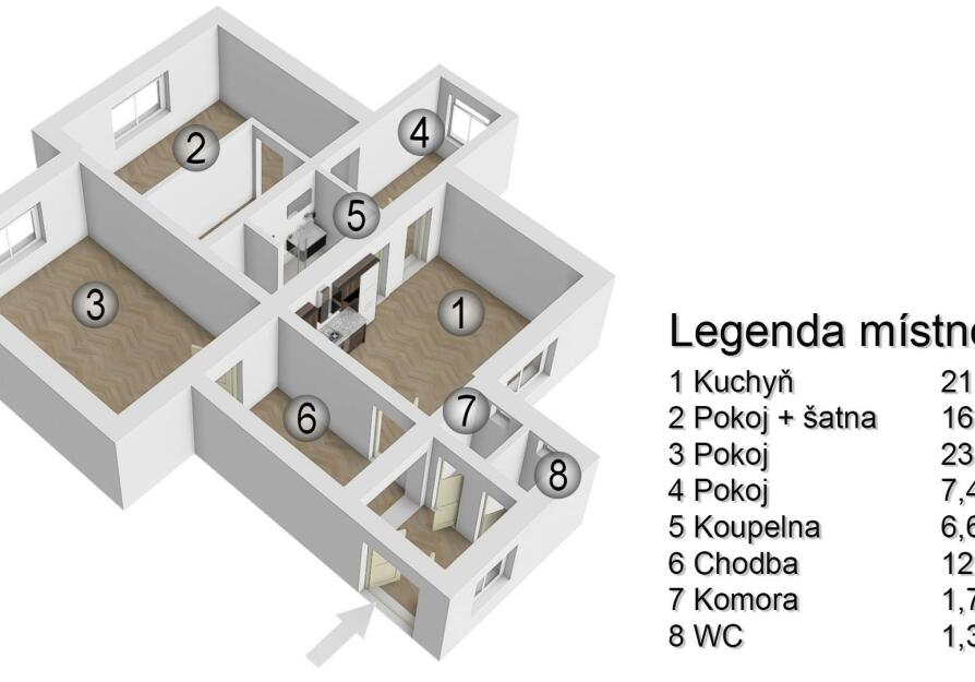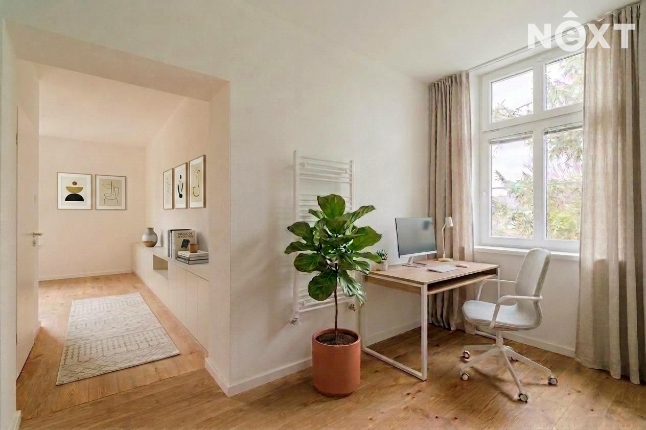 Velkou výhodou je nejen instalovaná klimatizační jednotka ale i vlastní kotel na zemní plyn sloužící k vytápění bytu a ohřevu teplé užitkové vody. V bytě je dispozici prostorná předsíň (12,89 m2), pokoj (23,81 m2), komora (1,72 m2), samostatná toaleta (1,29 m2), prostorná kuchyň (21,18 m2), koupelna 6,61 m2), pokoj (16,7 m2) s nově vybudovanou šatnou (7 m2) a malý průchozí pokoj (7,41 m2). K bytu náleží i sklad (15 m2) a podíl na společný prostorách nacházejících se v suterénu domu, dále podíly na ploše společného dvora a zahrady. Což nabízí novým majitelům bydlení téměř srovnatelné s rodinným domem.