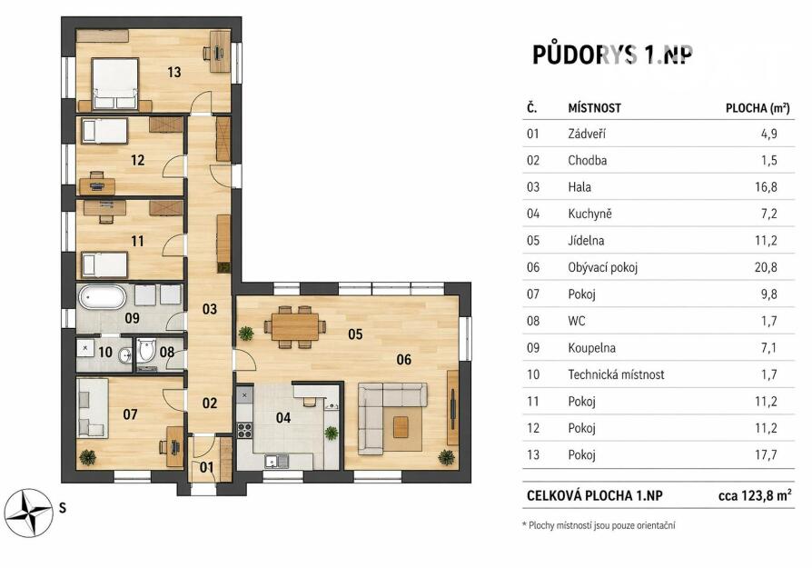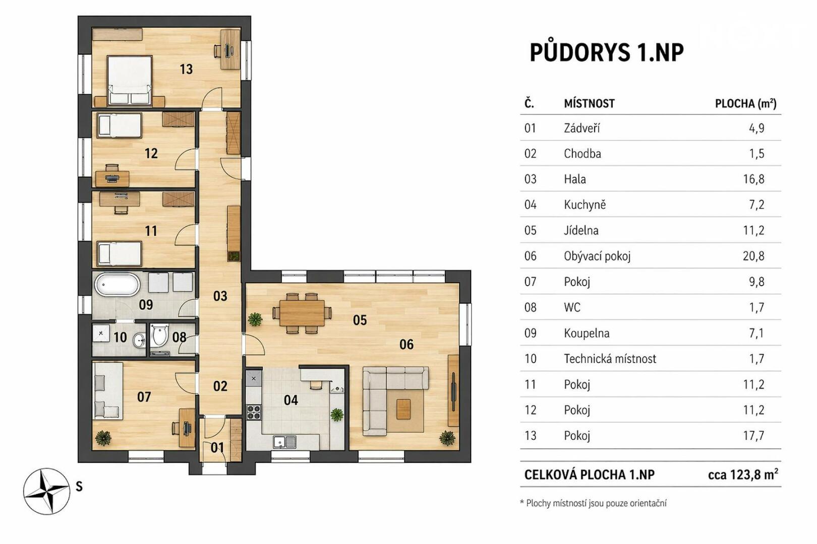 Součástí zázemí je koupelna (6,8 m²), samostatné WC (1,8 m²) a technická místnost (3,6 m²).