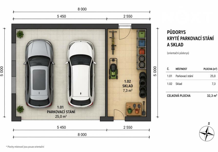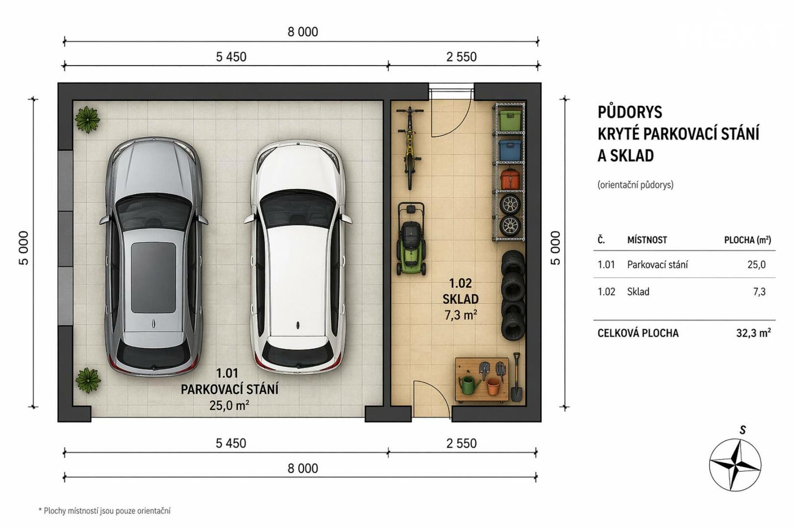 Na pozemku se nachází kryté parkovací stání pro 2 automobily a zahradní domek s úložným prostorem.