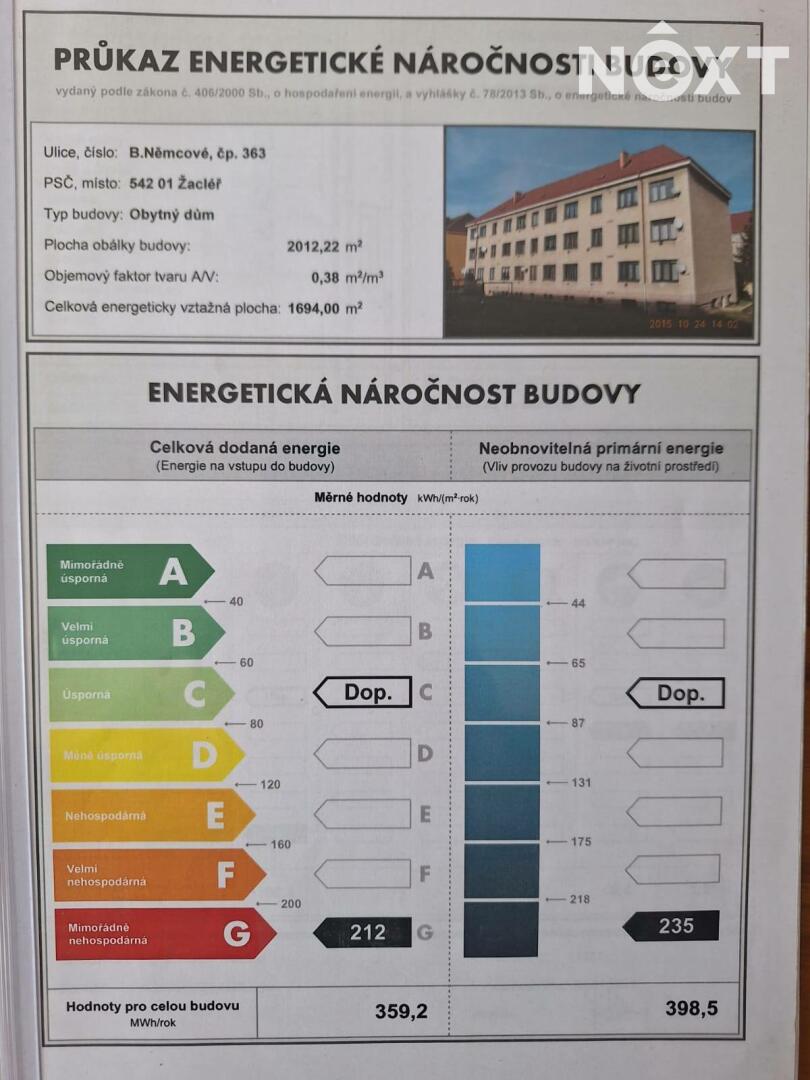 Ve výhradním zastoupení nabízíme byt 3+1 v Žacléři v ulici B. Němcové. Byt o celkové užitné ploše 67 m2 prošel částečnou rekonstrukcí koupelny a kompletní nová elektroinstalace. Vytápění je plynové (WAW), stejně jako ohřev vody (karma). Dispozice: předsíň s vestavěnými skříněmi (5,22 m2) , kuchyň 9,22, obývací pokoj (20 m2), ložnice 13 m2) a dětský pokoj (9,5 m2) samostatné WC, koupelna s vanou. K bytu náleží dva sklepy 1x 1,7m2 a 1x 5,2 m2. Původní zachovalé parkety. Dům prošel celkovou revitalizací včetně zateplení, plastová okna, nové stoupačky apod. Energetická třída C. Funkční SVJ s platbou 2.800 měsíčně včetně fondu oprav.