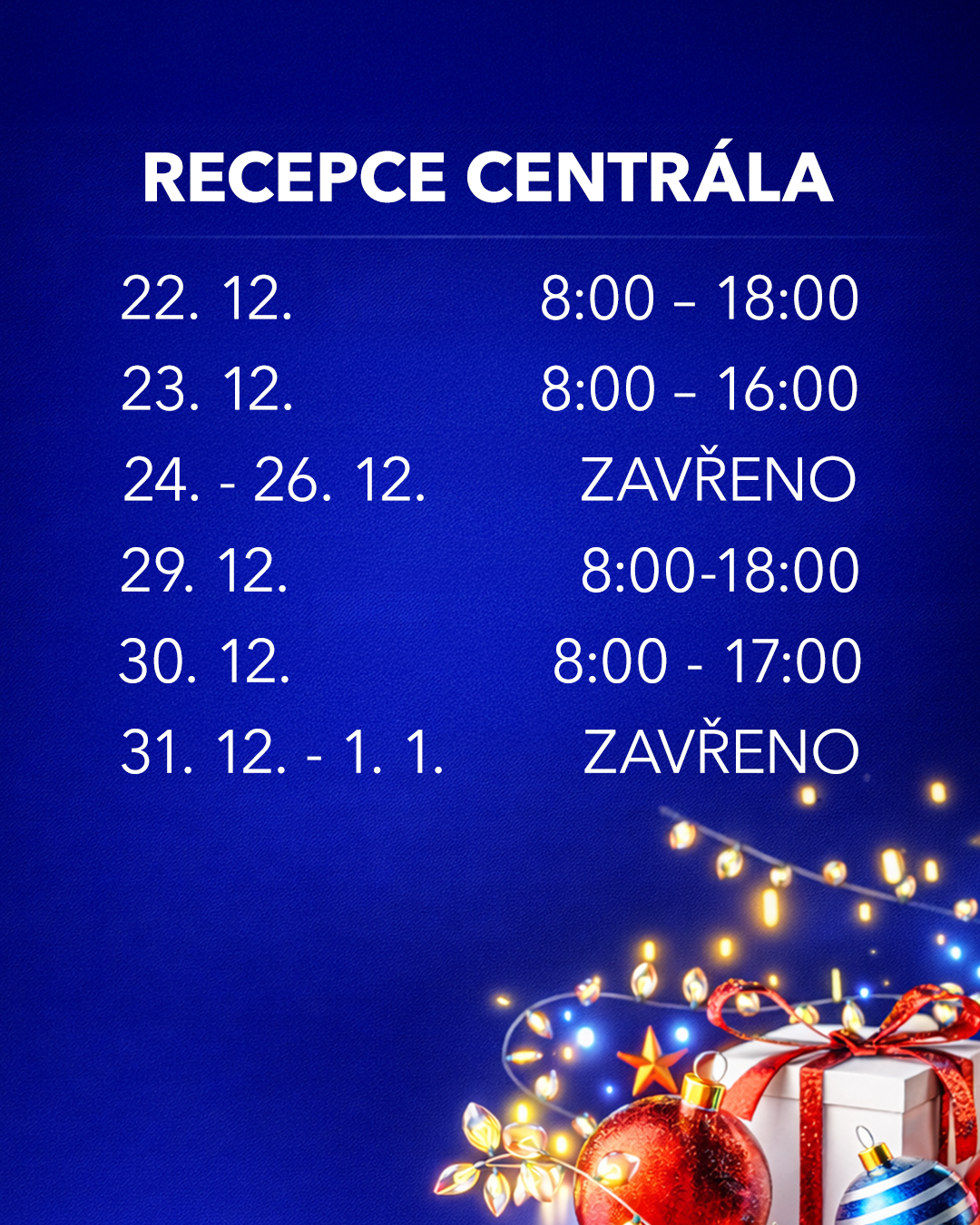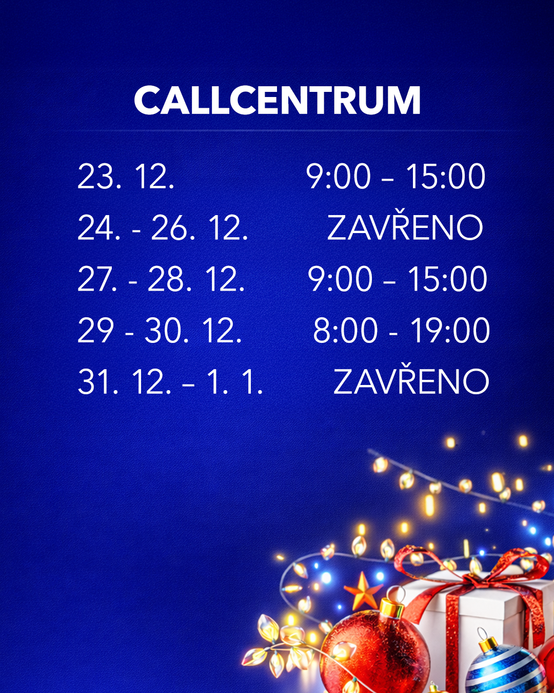 Během vánočních svátků fungujeme v upraveném režimu. Aktuální otevírací dobu našeho call centra a centrály společnosti najdete níže na přiložených obrázcích.